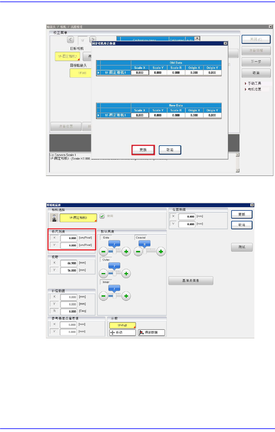 5. 按照上述方法对其余悬臂校准固定相机的X、Y Scale值与中心点。