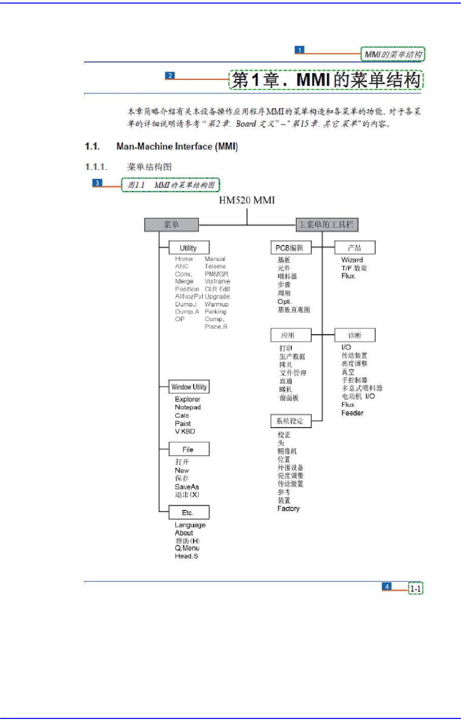 Cutting-edge Modular Mounter HM520 Administrator's Gui de xxviii Page Layout 1: 章节主题 / 手册名称 2: 章节主题 3: 图形 ( 章号 )-( 图形顺序 ) .( 图形主题 ) 第一章的第一个图形, , 图形的主题显示为 ’MMI 的菜单结构 图 ’ 。 4: 章节号码 - 页 ( 表示该第一章的第一页 )