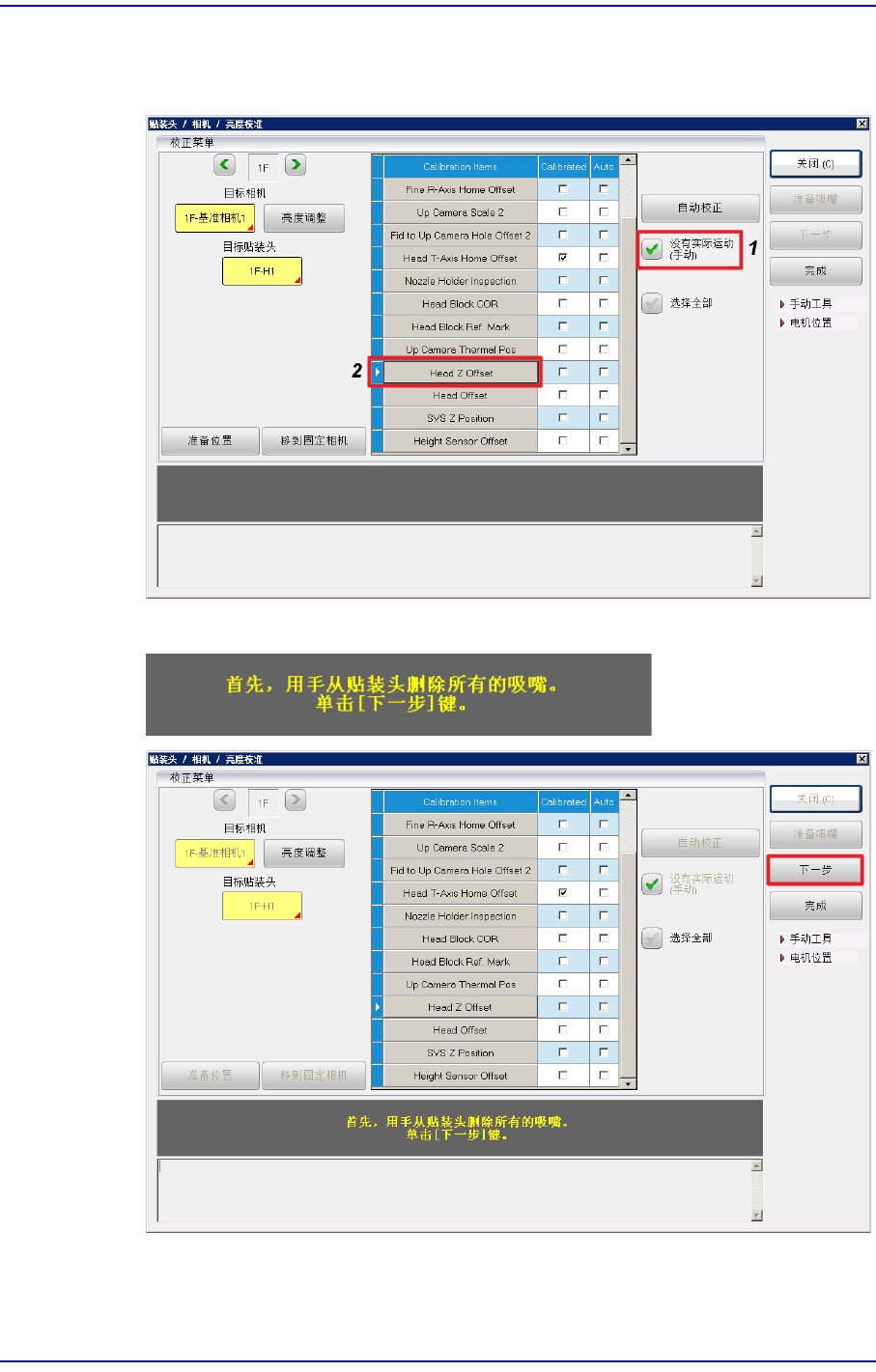 1. 选择<没有实际运动 (手动)>复选框后,按下 <Head Z Offset>按钮。