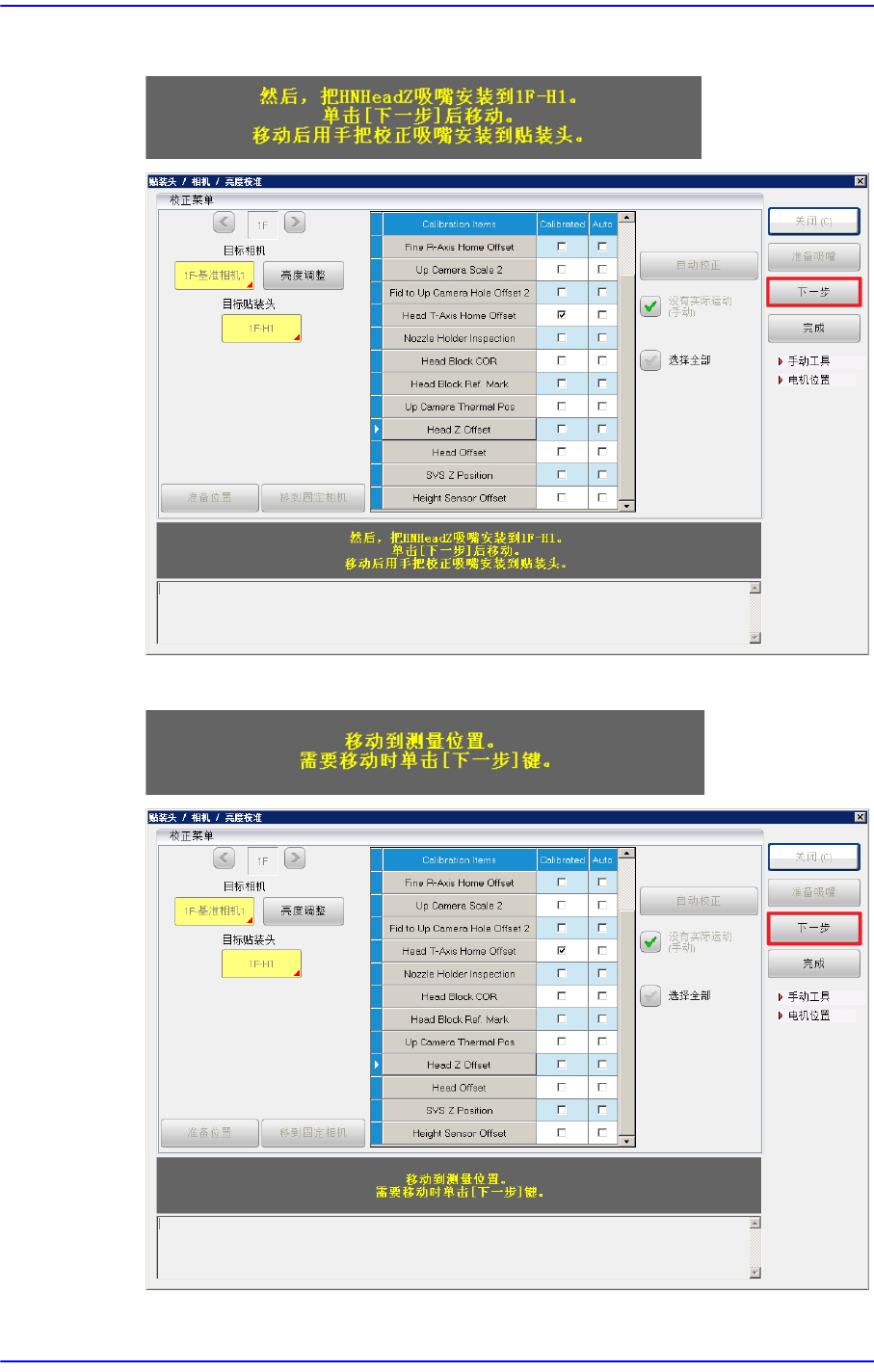 12-105 Machine Calibration Head Z Offset Calibration 的实行方法如下。 1. 选择 < 没有实际运动 ( 手动 )> 复选 框后, 按下 <Head Z Offset> 按钮 。 2. 若出现下列消 息, 按下 < 下一步 > 按钮。