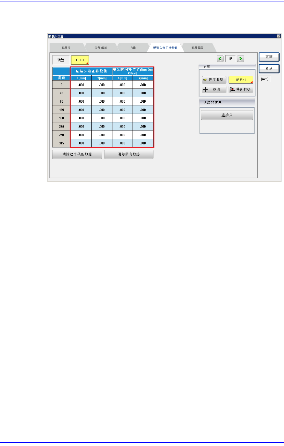 Run Out Offset和Head to Align Offset结果可以在<系统设置>的“贴装头” 对话