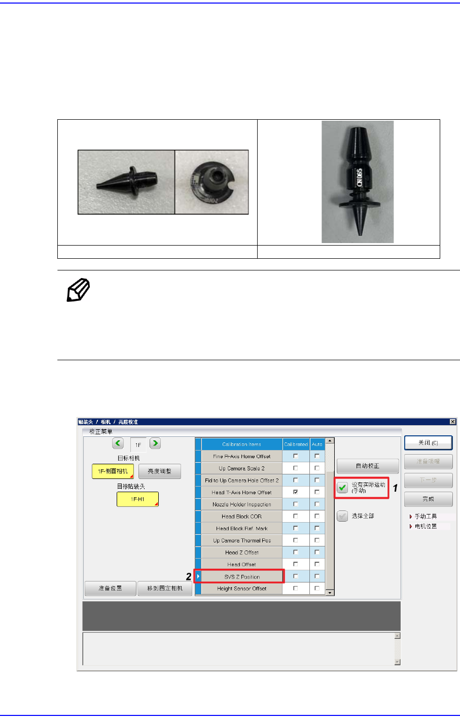 12-127 Machine Calibration 12.1.9.17. SVS Z Position Calibration (HSH, MFH) 该校准作业测量 SVS 相机 的中心到吸嘴末端为止的高度。 利用这里测量 出来的偏移 来检查有没有吸附元件、 元件厚度、 有没有插入吸嘴。 SVS Z Position Calibration 可以自动或手动执行。 Calibration T ool 备注 可自动对 Head Cal…