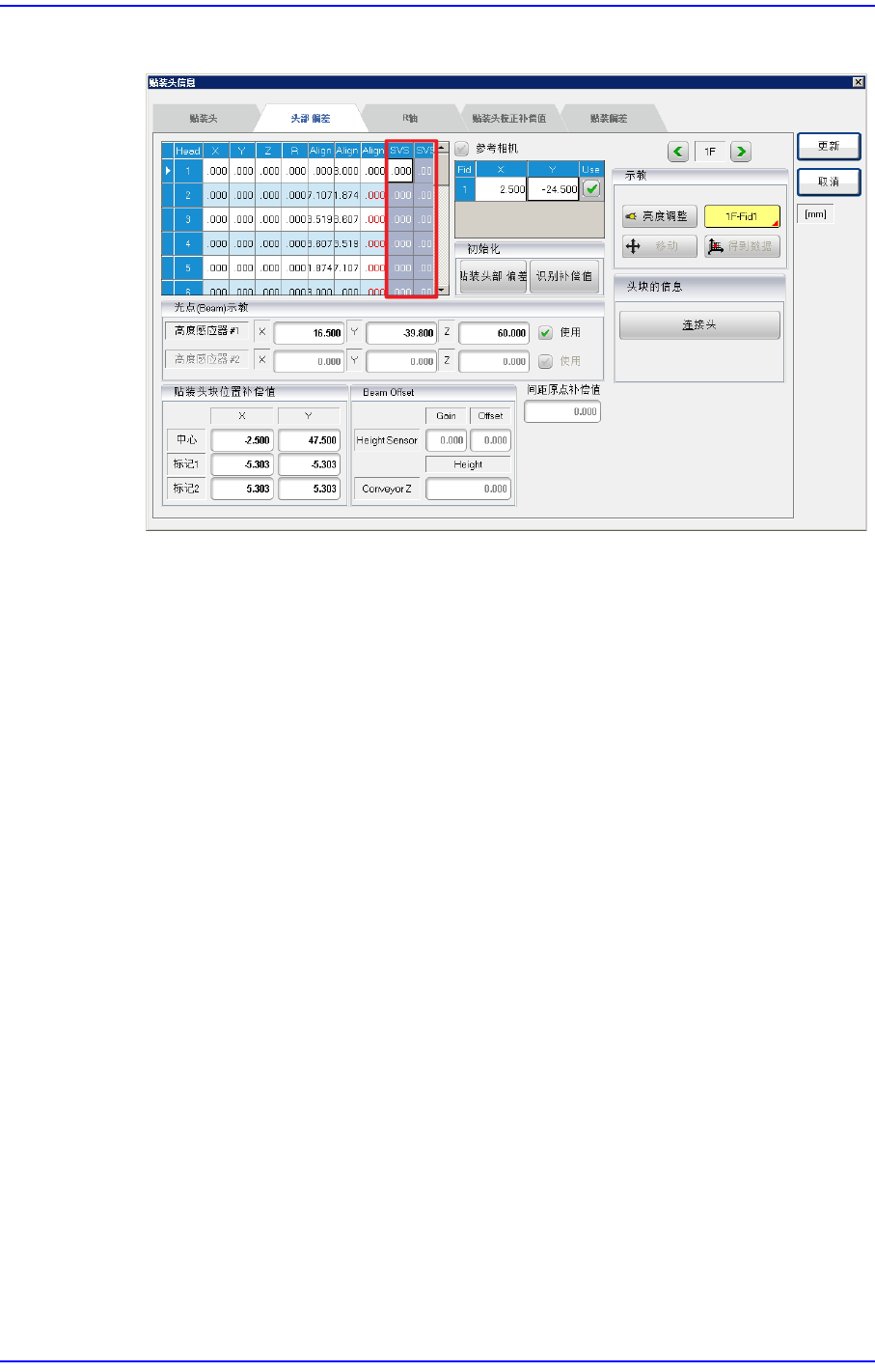 12-130 Cutting-edge Modular Mounter HM520 Administrator's Gui de 6. 1 号 Head 的 Calibration 完成后, 按下 < 下一步 > 按钮, 按 2~ 5 号步骤对 其他 Head 进行 Calibration 。 7. 全部贴装头的校准完毕后, 将如下出现结 果窗。 按下 < 更新 > 键就能适用 临时保 存的贴装头的偏移…