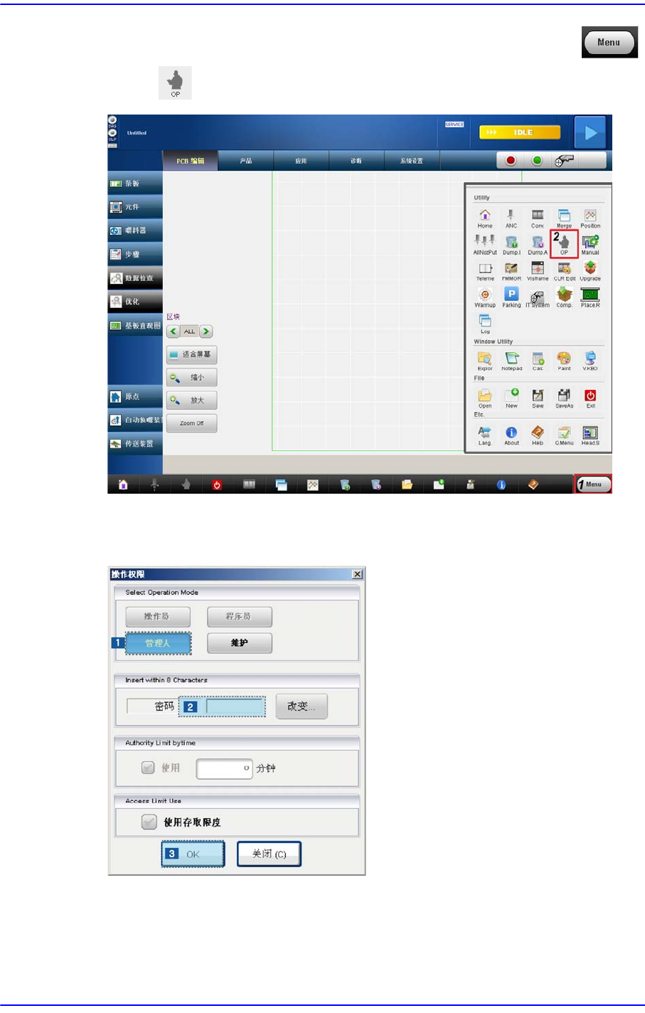 14-1 使用者模式及修改密码 第 14 章 . 使用者模式及修改密码 14.1. 使用者模式 设备运行方式共有四种方式。 各种方式根据 用户不同而区分, 各种方式接近 MMI 菜 单受限制。 14.1.1. 操作方式及设定 操作方式 操作员 设备的基本运行方式, MMI 设置成单纯 运行方式。 在这种方式下只能进行单 纯生产作业。 不需要密码。 程序员 (Programmer) 单纯用户的上位用户, 可进行 PCB 程序的…
