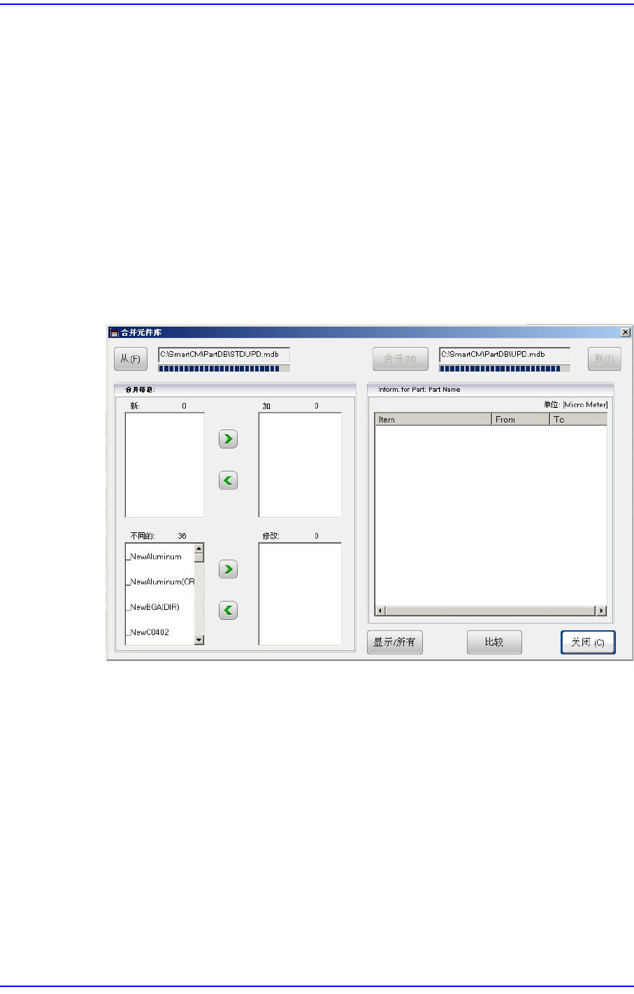 比较两个DB文件在<合并信息> 领域Target DB 文件中没有的部件信息显示在<