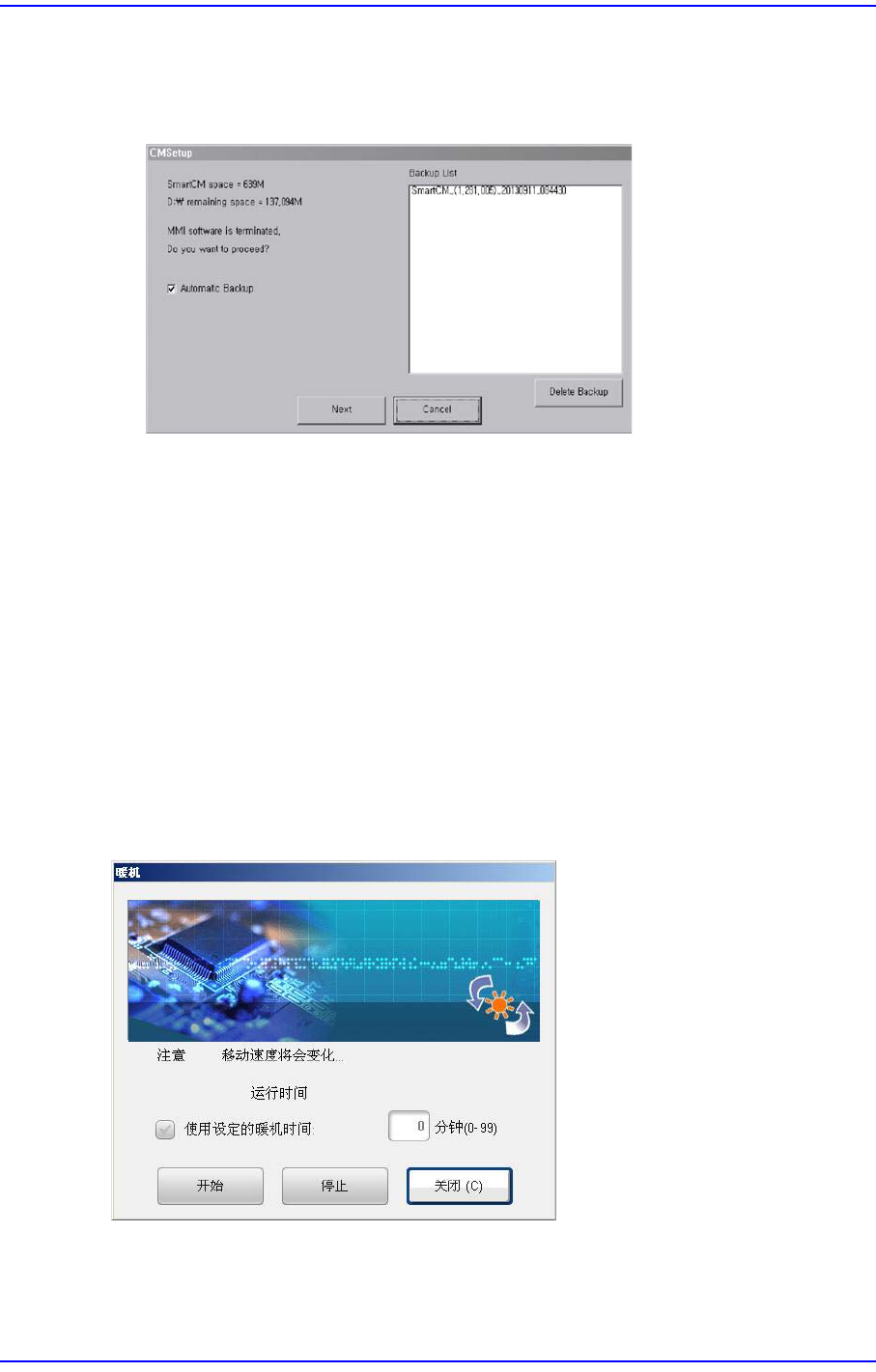 15-25 其它 菜单 <Next> 按钮 选择 <Select> 按钮并且完 成了 “Setup.exe” 文件的设定后, 按下 <Next> 按钮就会 出现下列对话框 <Backup List> 列表框 显示出需要进行数据备份的 MMI 的列表 <Delete Backup> 按钮 删除 <Backup List> 列表框中 的选定项目 . &l…