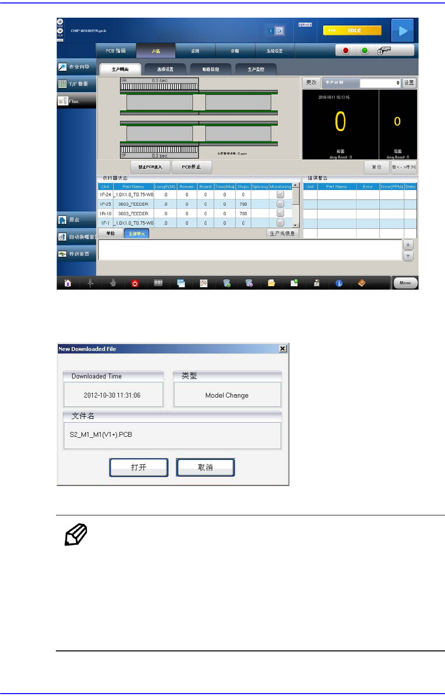 15-38 Cutting-edge Modular Mounter HM520 Administrator's Gui de 1: PC B 下载按钮 选择画面上端的 < 下载 PCB> 按钮就会实行下列对话框。 可以查看需要从 T -Solution 下载的 PCB 程 序信息。 备注 可以在正面通道与背面通道 打开不同的 PC B 文件后生产 不同的 PCB 。 在 MMI 上端左边的 < 前面 >…