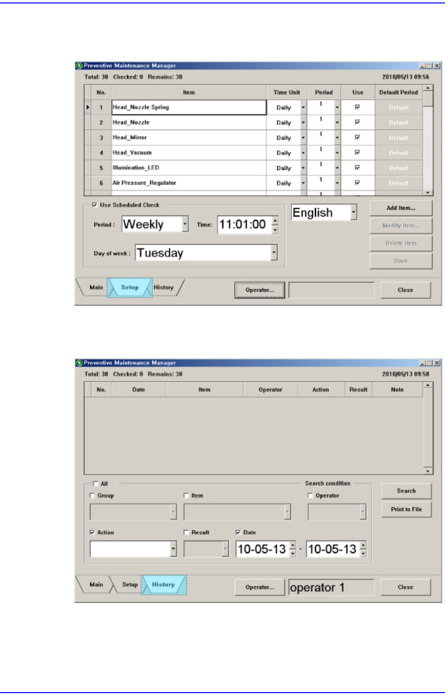 16-4 Cutting-edge Modular Mounter HM520 Administrator's Gui de 16.4. Main 画面 16.4.1. 查看检查项目 查看当日要检查的项目 当日需要检查的项目在 <Status> 列中显示红色 <Check> 按钮。 当日可以不检查的项目在 <Status> 列中显示黑色 <OK> 按钮 。 当日需…