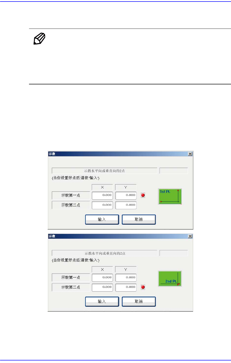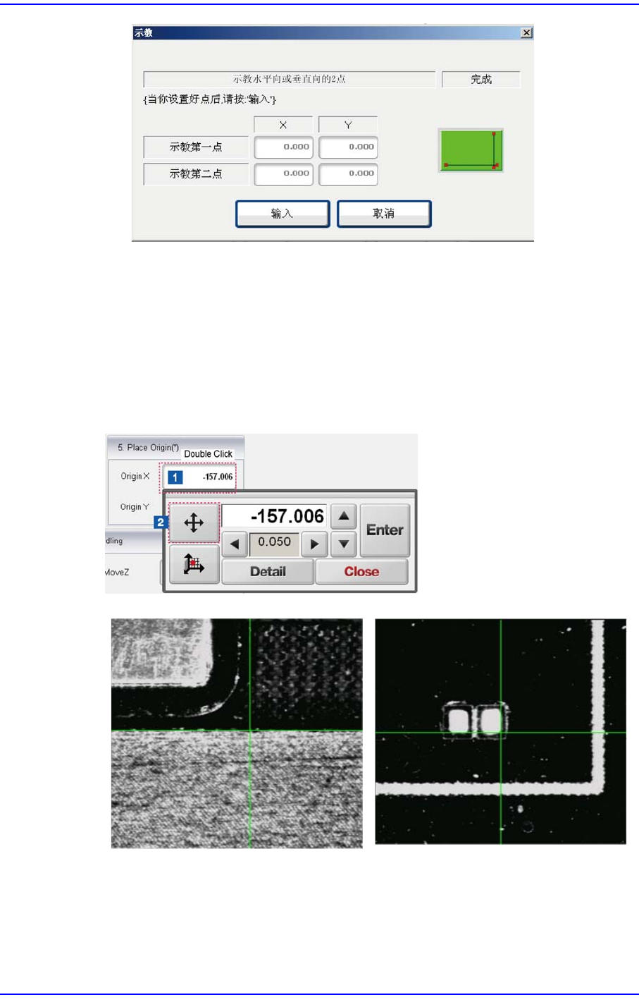 示教PCB 上横向,竖向平行位置的2个点中的第一点。示教后,按下” 输入”