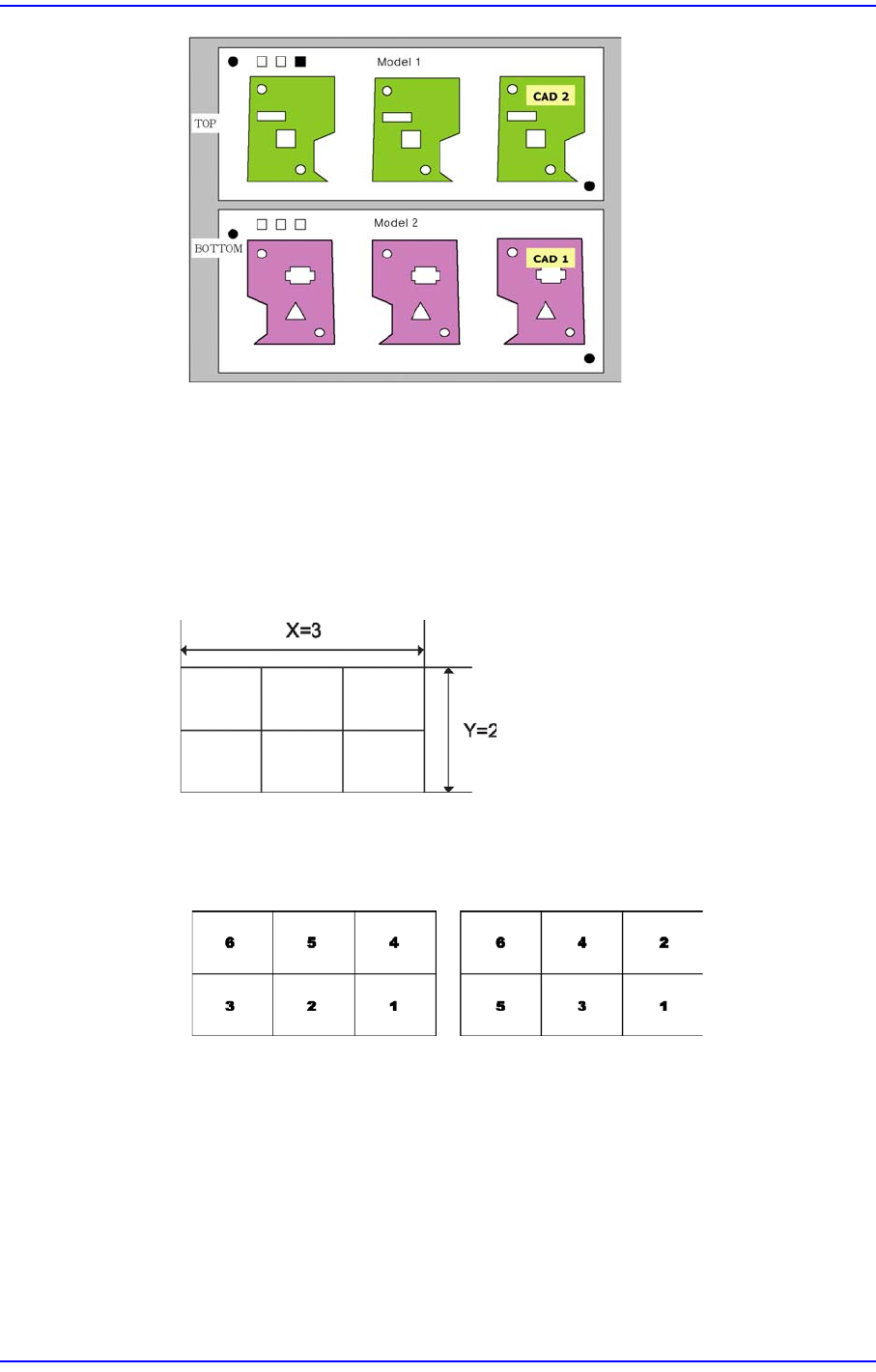 2-29 Board 定义 <4. 拼版设置 ( 标准类型 )> 领域 进行多片 PCB 的初始化。 此功能在多片 PCB 为常规的排列方式时 , 自动 设定各 单片的偏移量。 < 数量 > 编辑框 输入多片 PCB 的排列片数 双 击该编辑框, 就会出现可以输入数字的数字输 入窗口。 < 计数方向 > 选项按钮领域 选择多片 PCB 的各单片的编号方法。 识别 Array PCB 内的小…