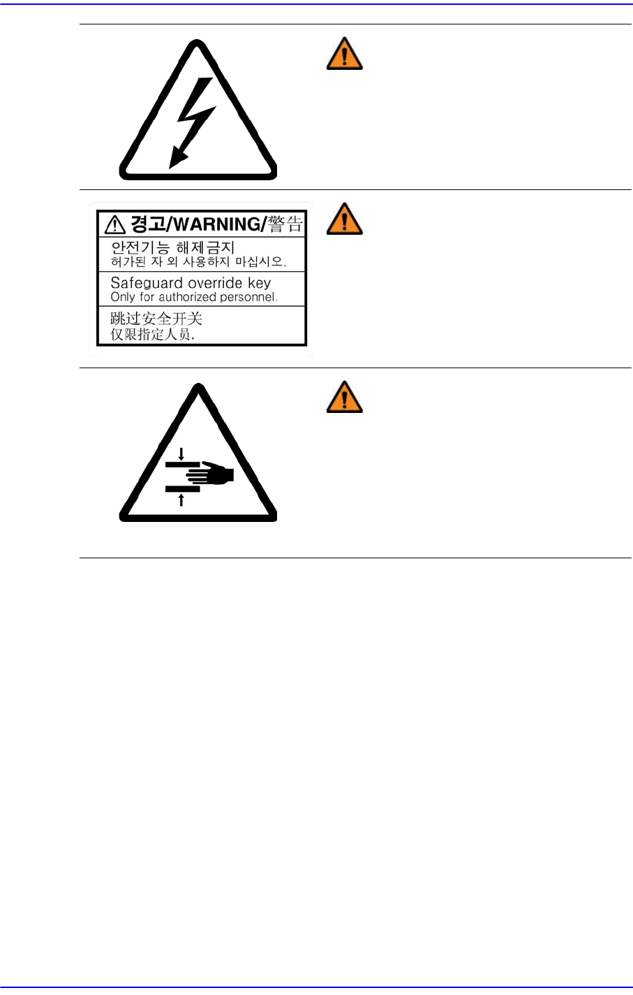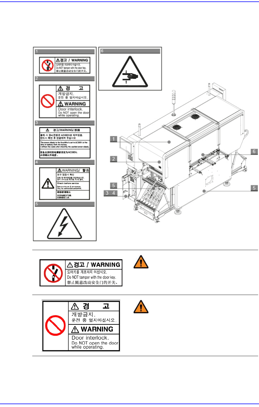 Cutting-edge Modular Mounter HM520 Administrator's Gui de iv 警 告 盖内侧及周围连接物部位存在 高电压要注意 电击危险。 在维护和修理设备操作时一定 要先切断主电 源。 警 告 请勿除去安全功能。 可能发生人命伤害和 深 刻的问题。 警 告设备运行时请勿伸进手 贴有此标签处有移动体, 驱动中拆开或打 开 盖把身体的一部分伸进设备内 部时非常危 险。 维修前请停止设备…