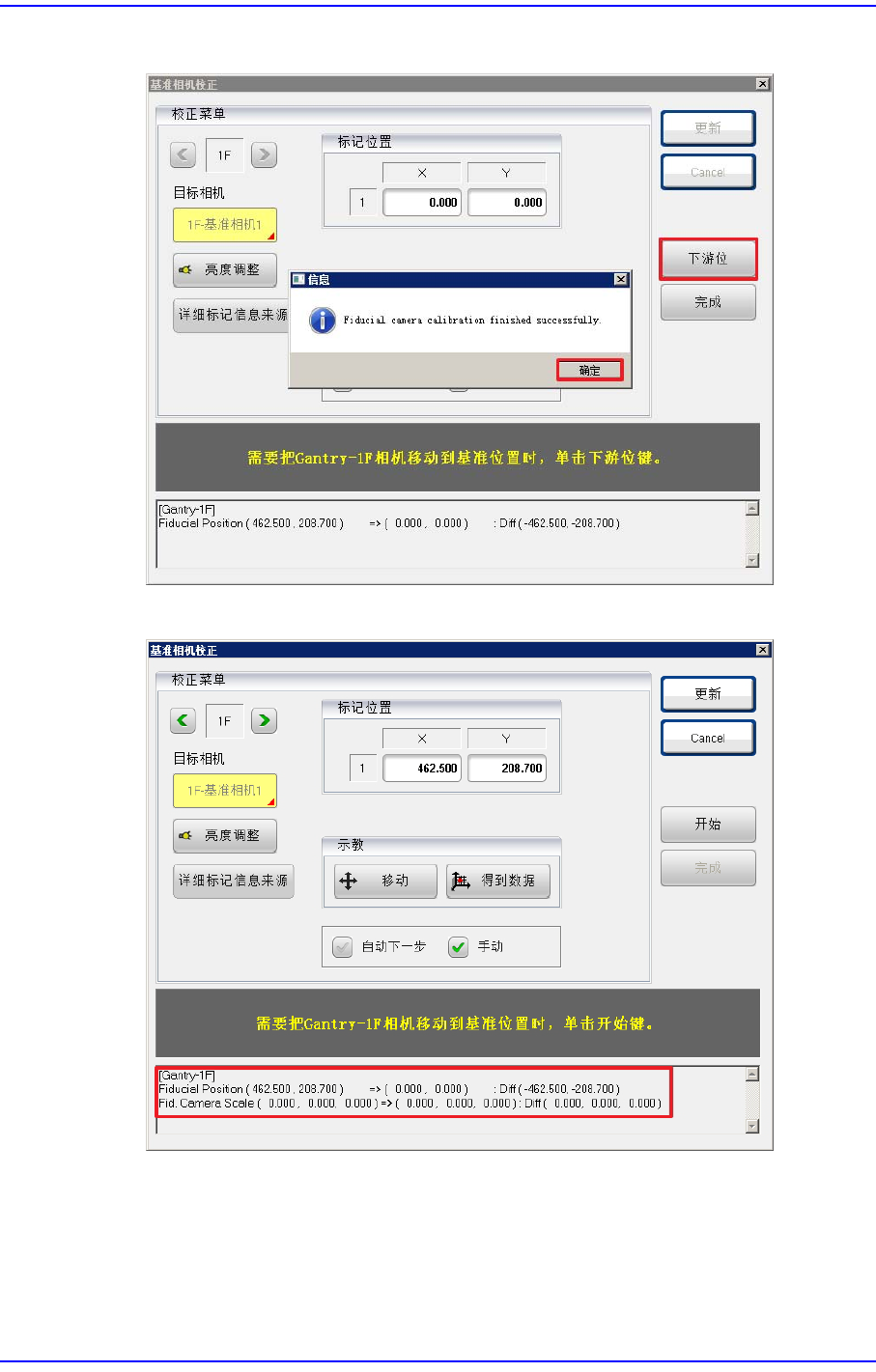6. 完成对Gantry ‘1F’的Calibration后,在 “基准摄像机Calibration” 对话框中点击