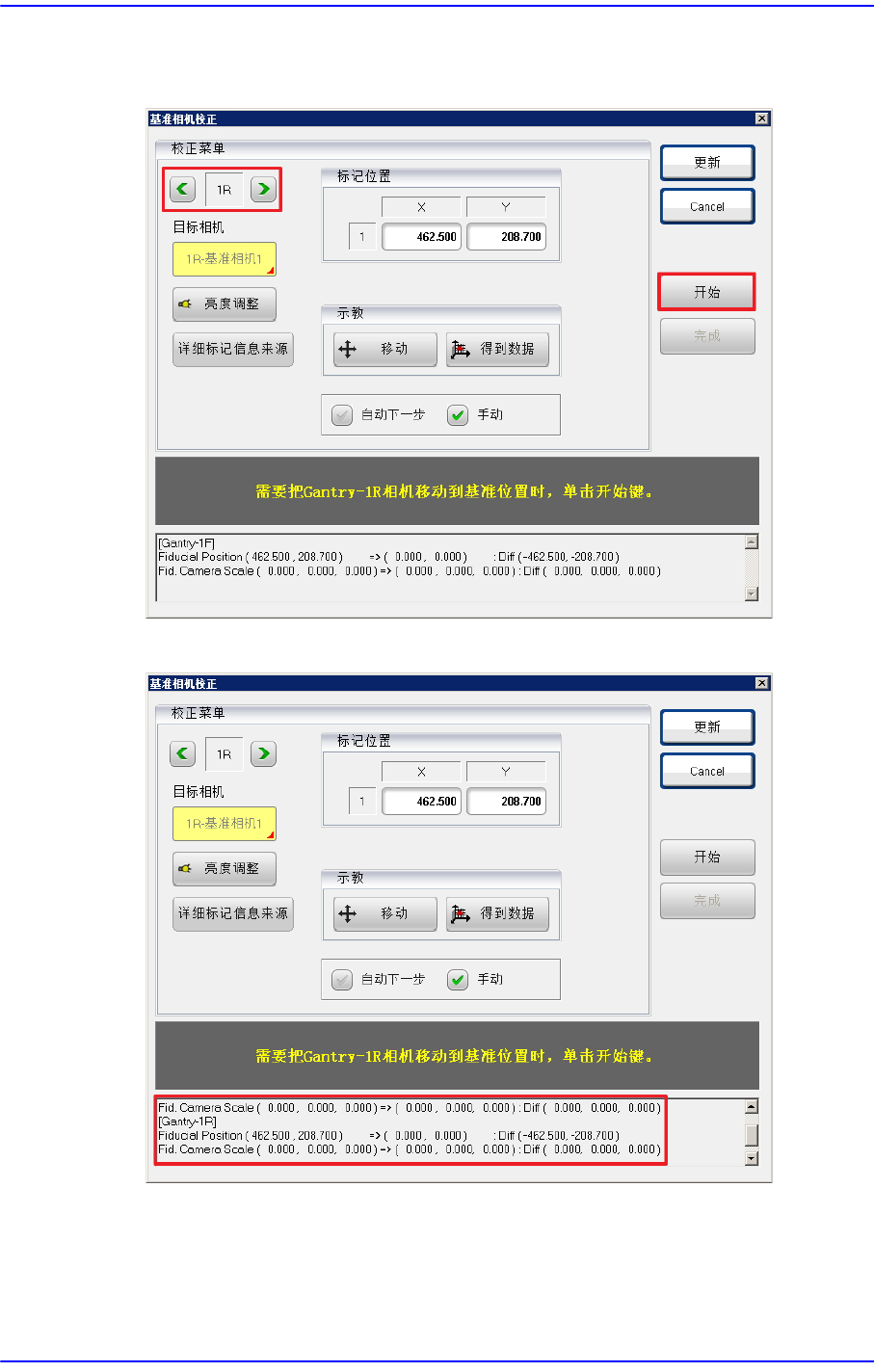 12-20 Cutting-edge Modular Mounter HM520 Administrator's Gui de 6. 完成对 Gantry ‘1F’ 的 Calibration 后, 在 “ 基准摄像机 Calibration” 对话框中点击 Gantry 选择箭头按 钮, 对于 1R 也请以相 同方式执行 Calibration 。 7. 要适用新的校正值请点击 <Update> 按钮。