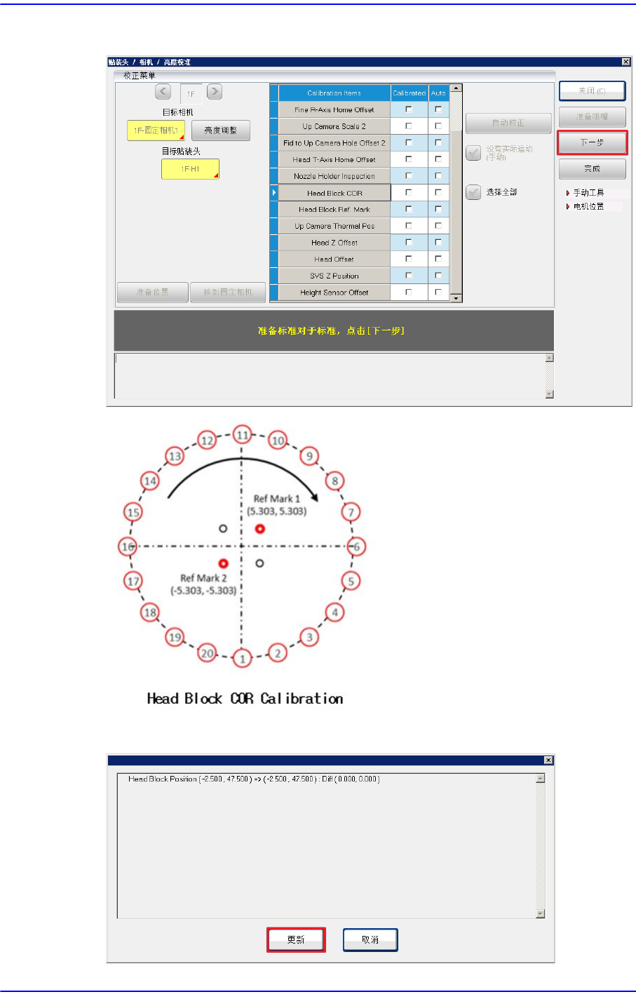 12-86 Cutting-edge Modular Mounter HM520 Administrator's Gui de 2. 按下 < 下一步 > 键时, 贴装头模组朝固定相 机移动并自动进行校准 (Calibration) 。 3. 校准完毕后, 将如下出现结果窗。 按下 < 更新 > 按钮就能适用结果 值。