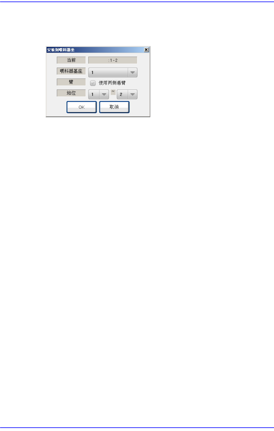 13-8 Cutting-edge Modular Mounter HM520 Administrator's Gui de < 占用的站位 > 领域 使用已选择的盘式喂料器单位 时, 设定被该盘式占有的喂料器基座单位和 Slo t 。 点击 〈安装〉 按钮则显示如 下设置画面。 < 喂料器基座 > 组合框 选择要安装 tray feeder 的喂料器 底座。 可选择的喂料器底座为正面 1 和背…