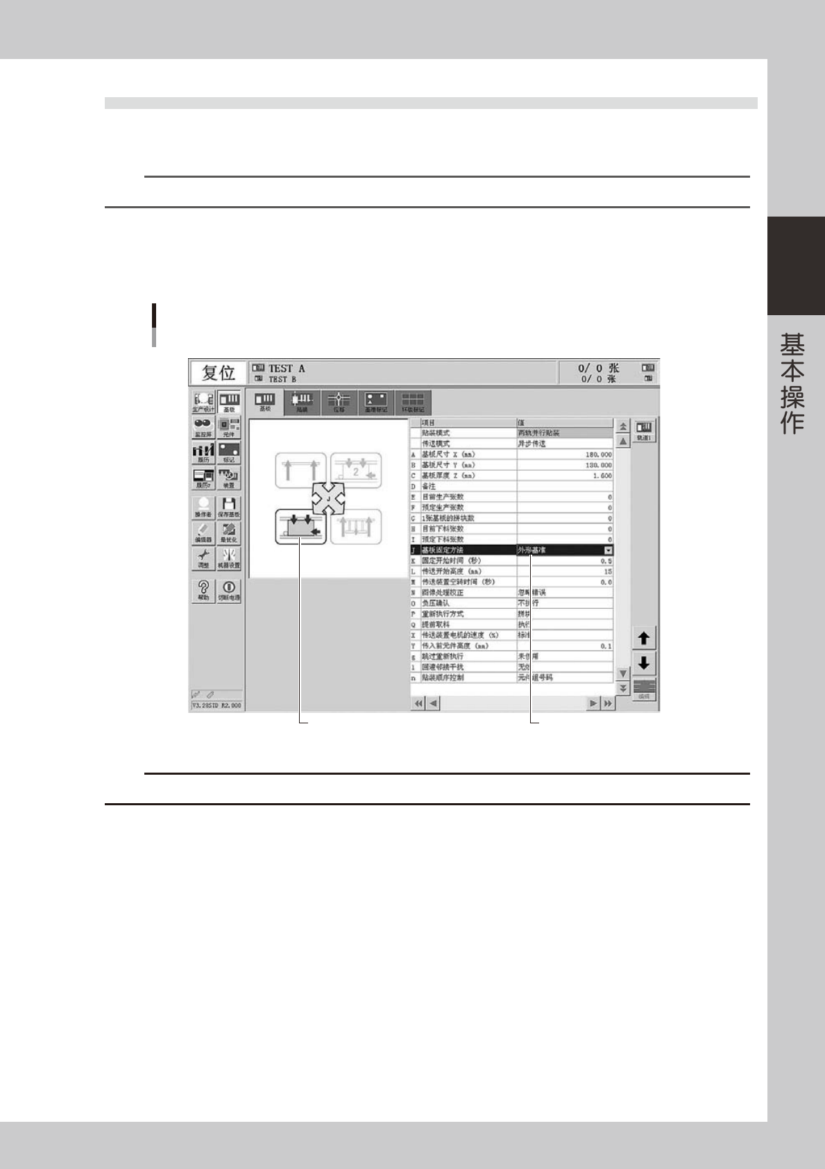 2-26 2 3.4.1 作业流程 按如下所示「调节流程图」调节传送装置。 调节传送宽度 放置基板 按[传送宽度]按钮 按[移至贴装位置]按钮 双段传送台 单轨 双轨 排列顶针 按[顶板]按钮,升起顶板 按[顶板]按钮,降下顶板 确认基板的固定状态 取出基板 将贴片机置于紧急停机状态 将贴片机置于紧急停机状态 解除贴片机的紧急停机状态 移至贴装位置 调节流程图 传送装置 25203-L4-10 1 调节传送宽度。 确认已选中想要调节传送…