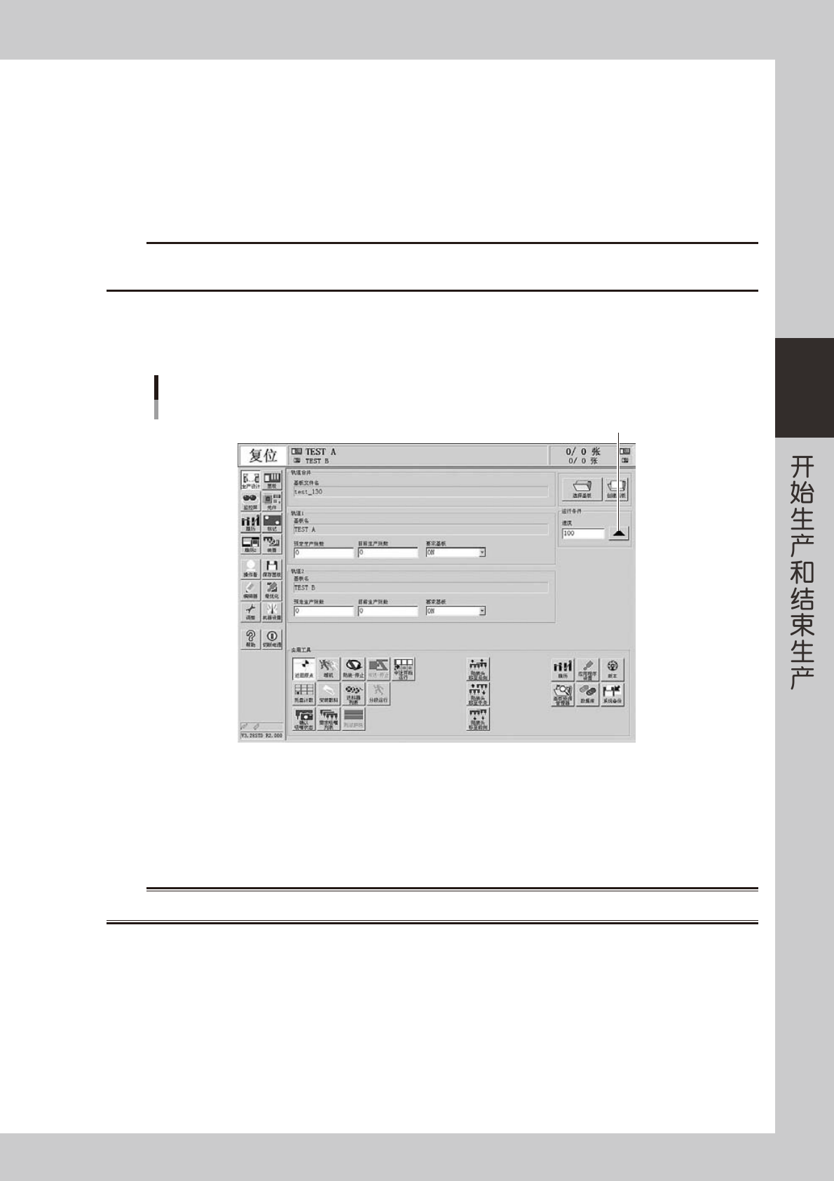 3-2 3 n 要点 在双轨贴片机中使用两条轨道进行生产时,用轨道切换按钮切换至想要操作的轨道后再进行调整和确认。 2 调节传送装置。 打开 [ 装置 ] -「传送装置」选项卡,根据基板调节传送宽度和顶针。详细内容参阅第 2 章「3.4 传送装置 的调节」 。 「装置」-「传送装置」画面 以双轨为例 26301-L4-10 3 确认其它设置项目。 返回「生产设计」画面,按以下按钮进行必要的确认和设置。 3 1 2 4 「生产设计」画面 …