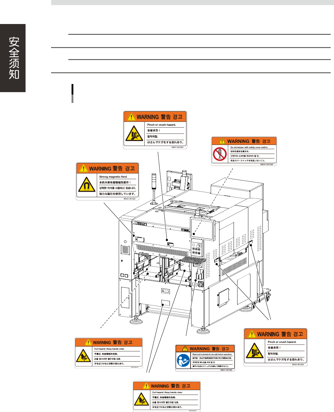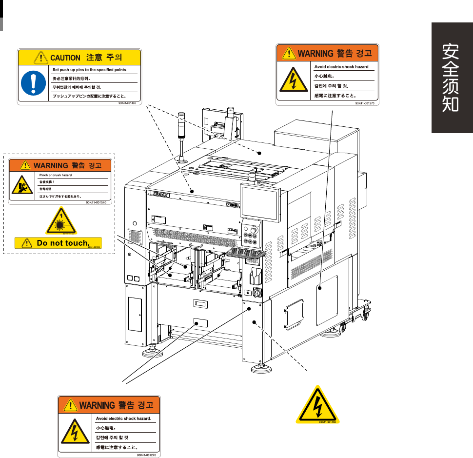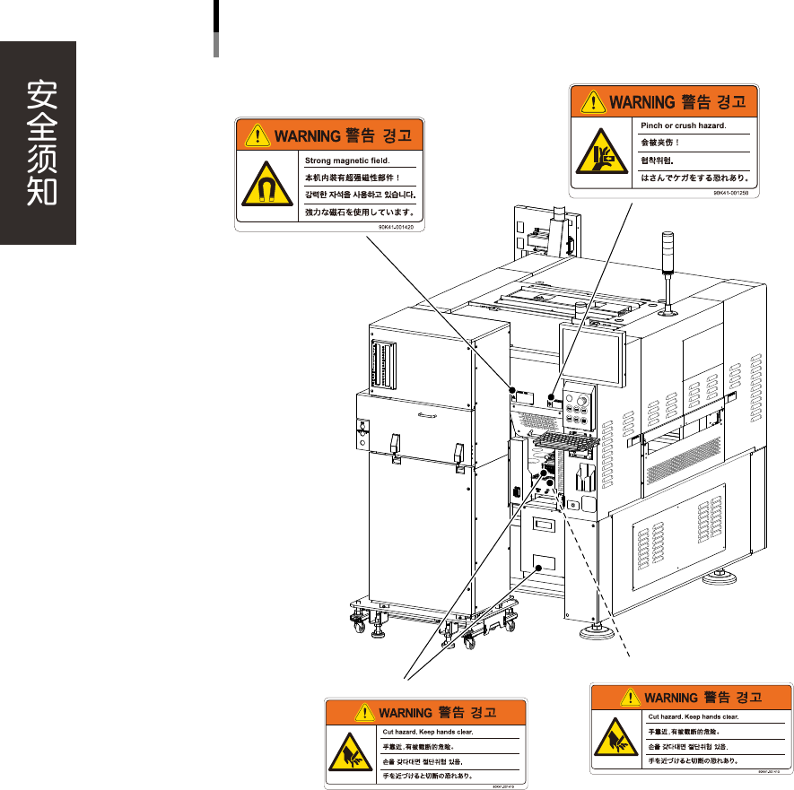 为了安全使用机器,如下图所示,在设备各个部位张贴了警告标贴,务必严格遵守标贴指示。此外,关于本节所