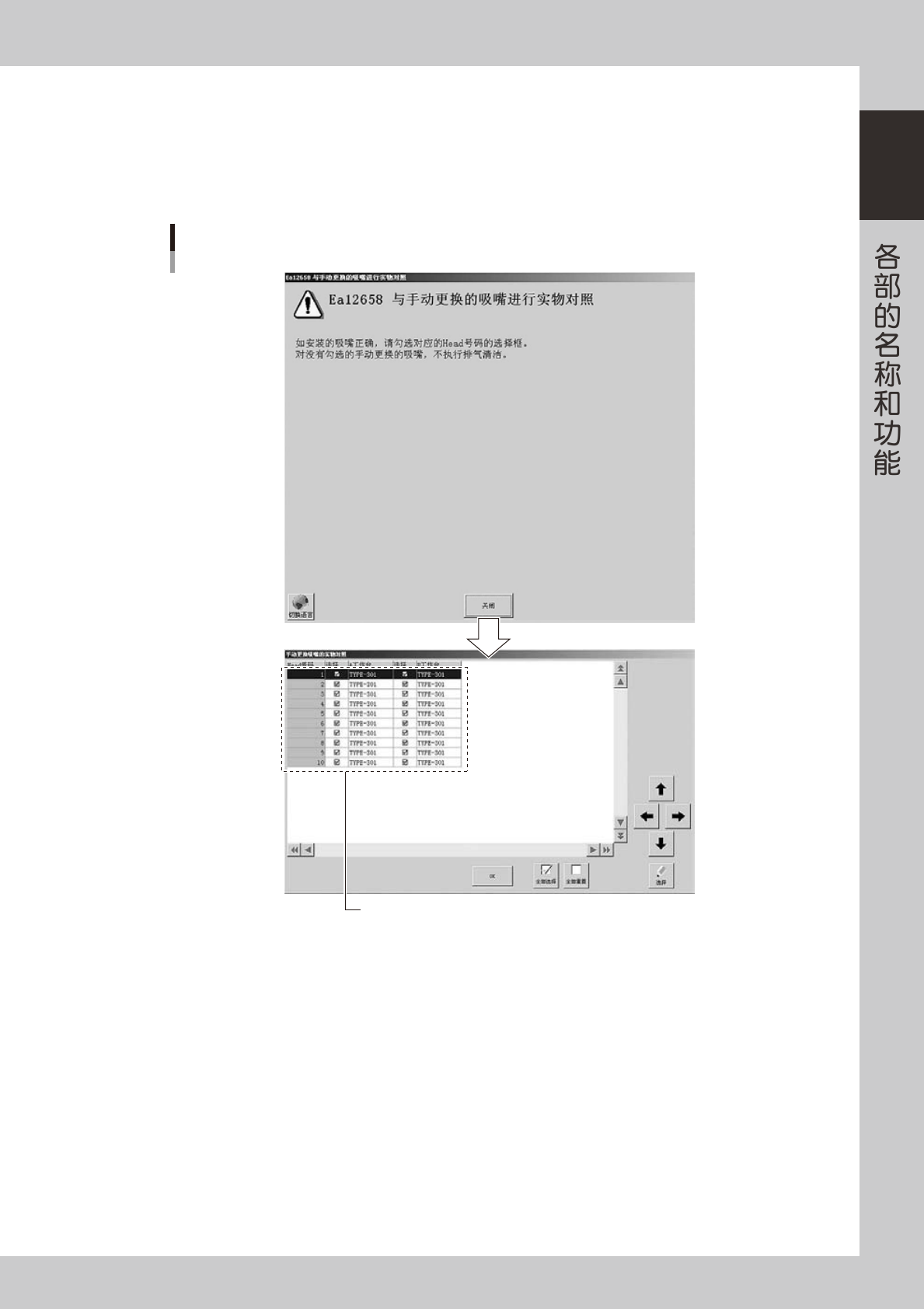 「与手动更换的吸嘴进行实物对照」对话框