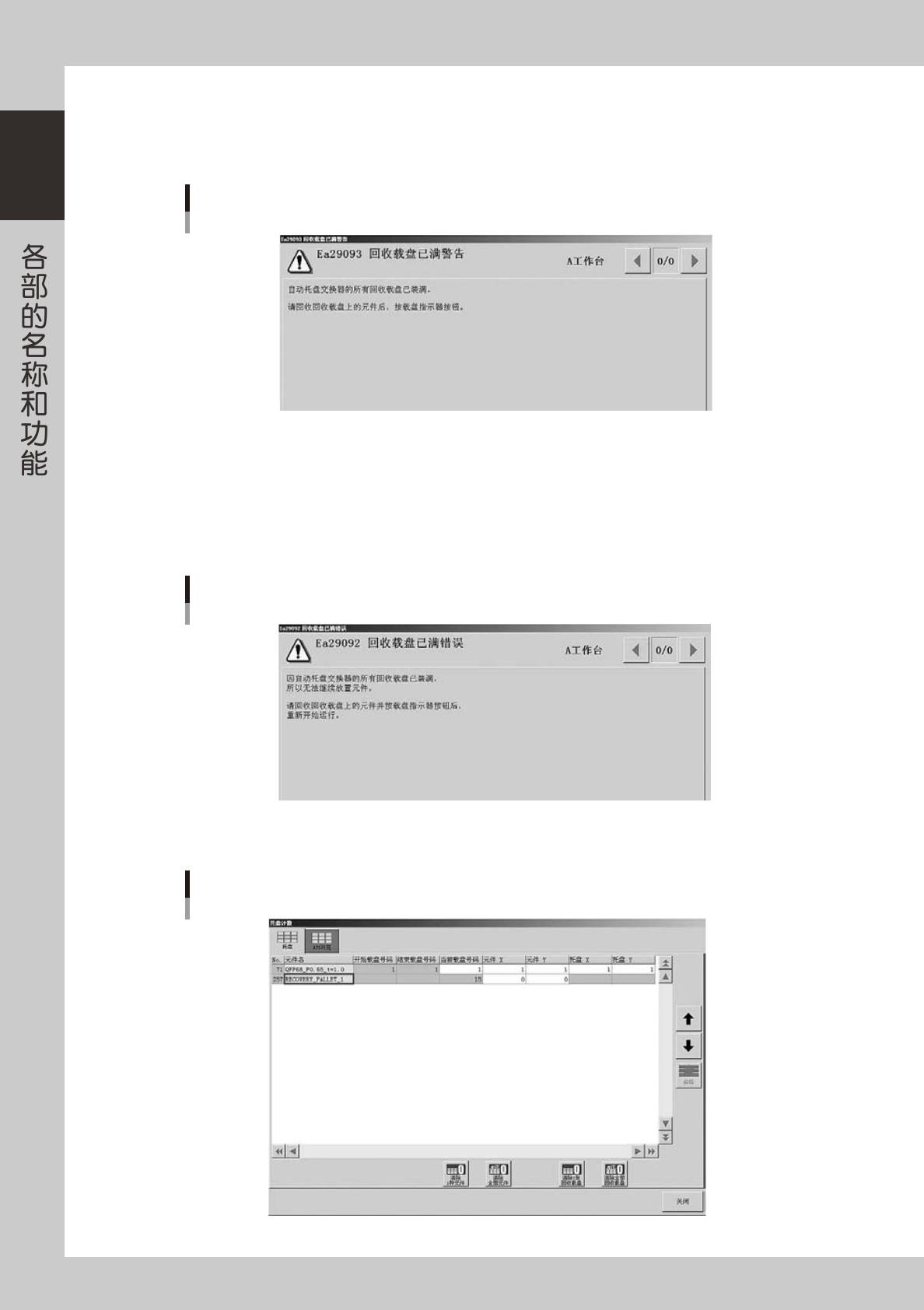 1-36 1 ■ 运行过程中会发生的错误与解决方法 Ea29093 : 回收载盘已满警告 所有回收载盘已装满时显示以下警告。继续运行直至下次丢弃动作。 回收载盘已满警告 26105-L4-00 Ea29092 : 回收载盘已满错误 所有回收载盘已装满, 无法继续向回收载盘丢弃元件时, 发生以下错误。贴片机会停止运行, 此时必须按照以下步骤恢复运行。 1. 取出回收载盘并取下元件后,将回收载盘放回原位。 2. 按闪烁的指示器按钮清除计…