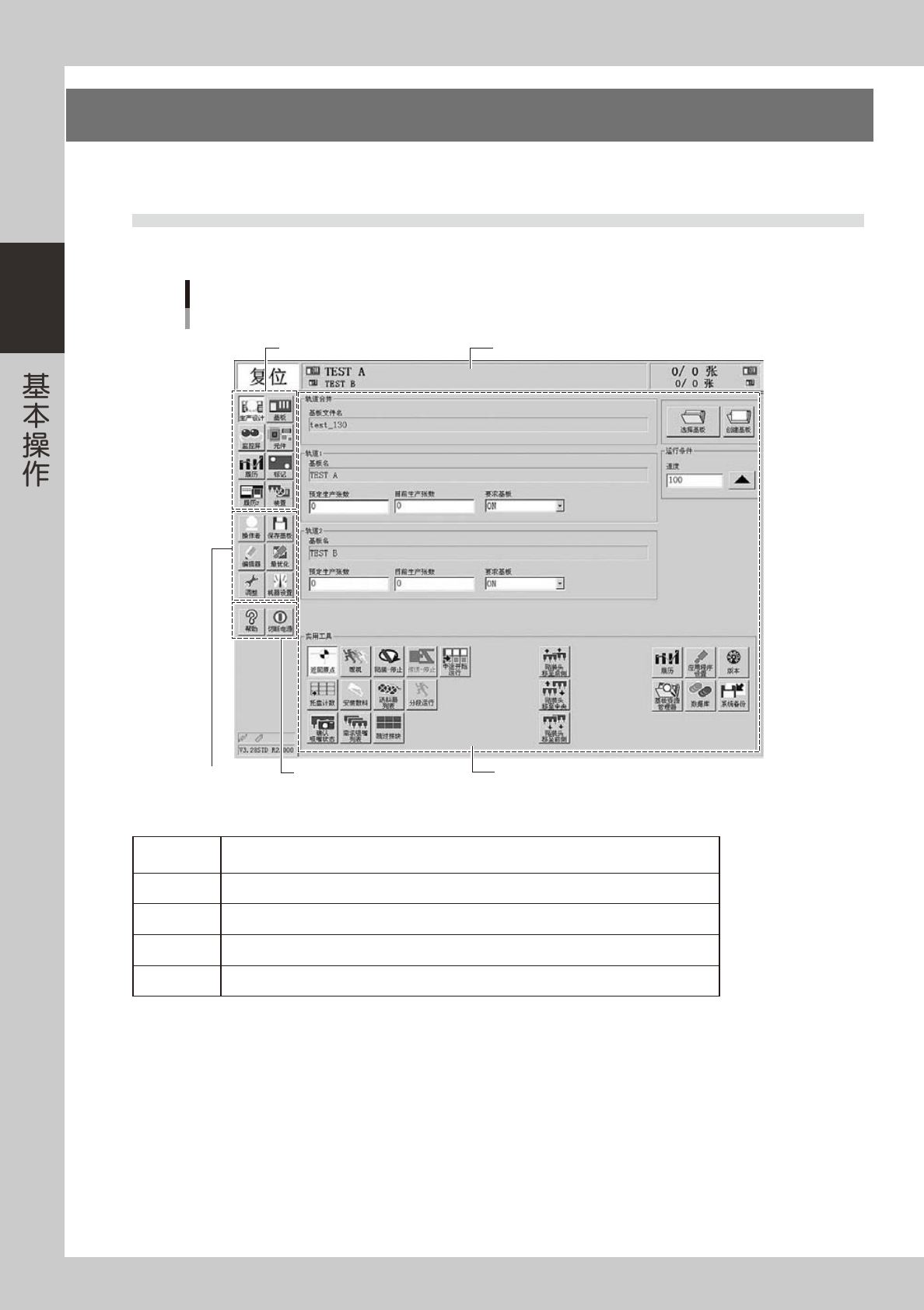 左端显示当前的机器状态 ; 中央显示所选基板的名称 ; 右端显示基板的生产张数。