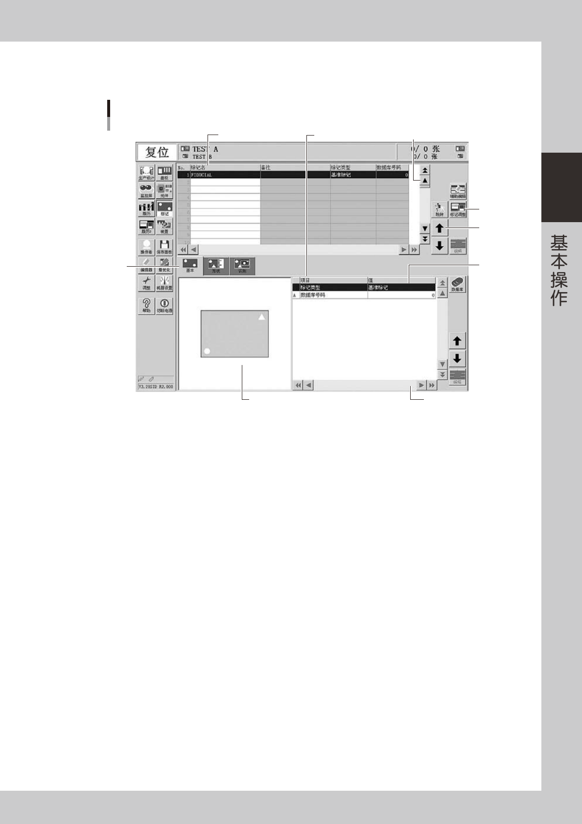 2-9 2 ■ 各种按钮和输入框 操作画面上设置有各种按钮、选项卡、输入框等。 1 1 2 3 4 6 操作画面示例 标记画面 参数列表 数据No.列表 5 26201-L4-00 1. 滚动条 & 按钮 ( 纵、横 ) 查阅数据 No. 列表、参数列表时,当前画面无法完全显示所有项目时使用。 2. 操作按钮 根据目的,打开次项操作画面和对话框时使用。 3. 行移动按钮 查阅数据 No. 列表、参数列表时,逐行上下移动光标时使用…