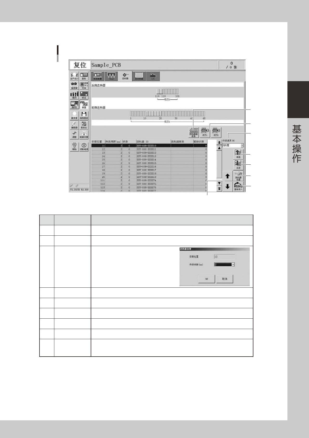 2-18 2 ■ I/O 手动操作 「装置」-「I/O」画面 1 2 3 26212-L4-00 名称 功能 1 「信号输出」下拉框 切换信号输出侧的显示区。 ‧ 送料器 ‧ 吸嘴交换站 ‧ 传送装置 ‧ Head ‧ 排气站 ‧ 其他 2 「信号输入」下拉框 切换信号输入侧的显示区。 ‧ 联锁 ‧ 原点极限 ‧ 预备 ‧ 送料器 ‧ 吸嘴交换站 ‧ 传送装置 ‧ 废气站 ‧ Head ‧ 排气…