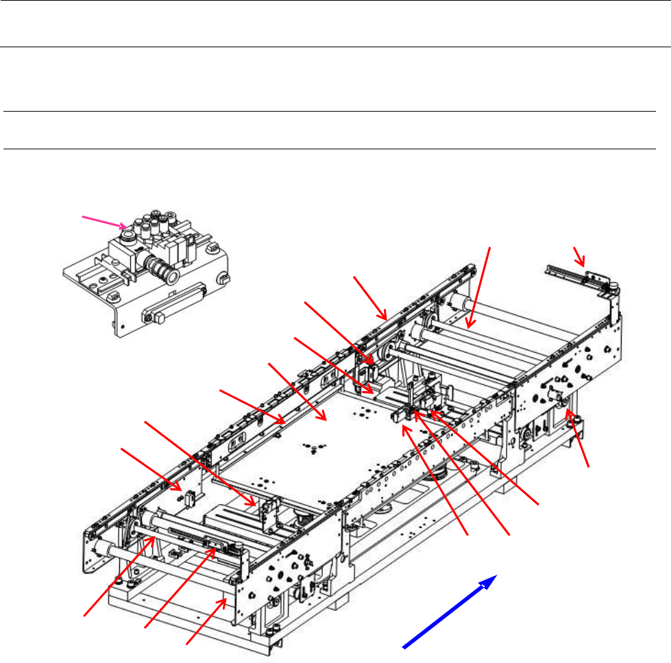 维修调整要领书 1 1-46 11-8 传送单元 11-8-1 传送单元的构成 传送单元的构成图如图 1 1-8-1-1 所示。 图1 1 -8-1-1 1 IN 传感器 9 驱动轴 2 OUT 传感器 10 支撑台 3 W AIT 传感器 11 自动调整宽度马达 4 C-OUT 传感器 12 支撑销检测传感器发光 5 PWB 导轨 13 支撑检测传感器受光 6 支撑台原点传感器 14 STOP 传感器 7 传送电磁阀 15 止动器 8…
