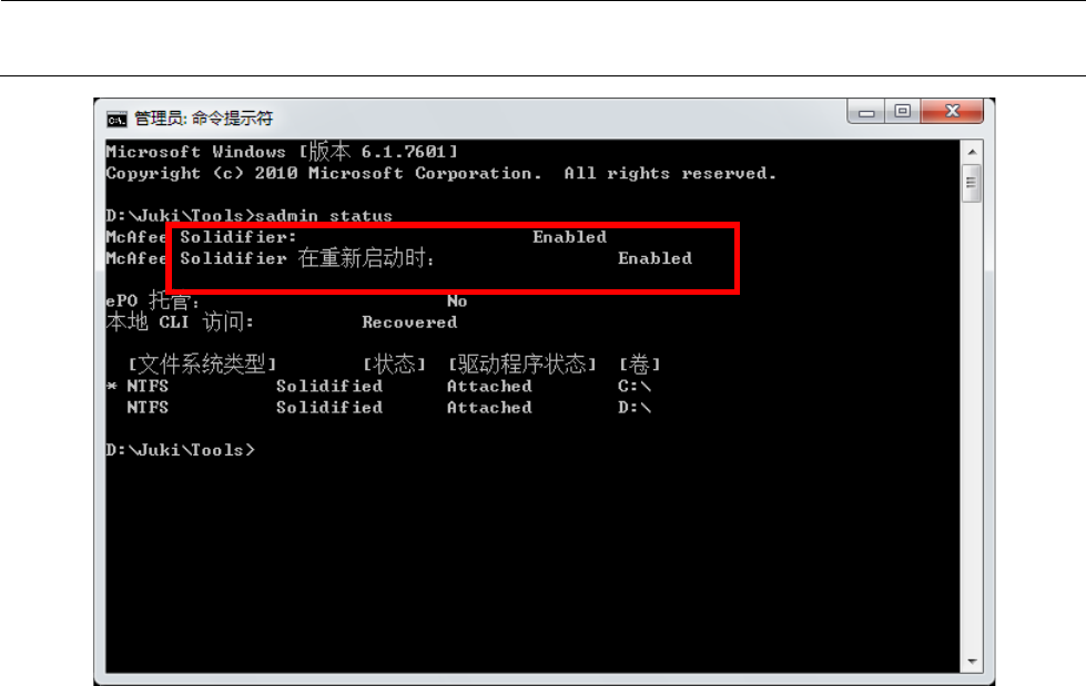 机的电源。从新接通后再次显示“McAfee Solidifie 命令提示符”,输入“sadmin status”进行再
