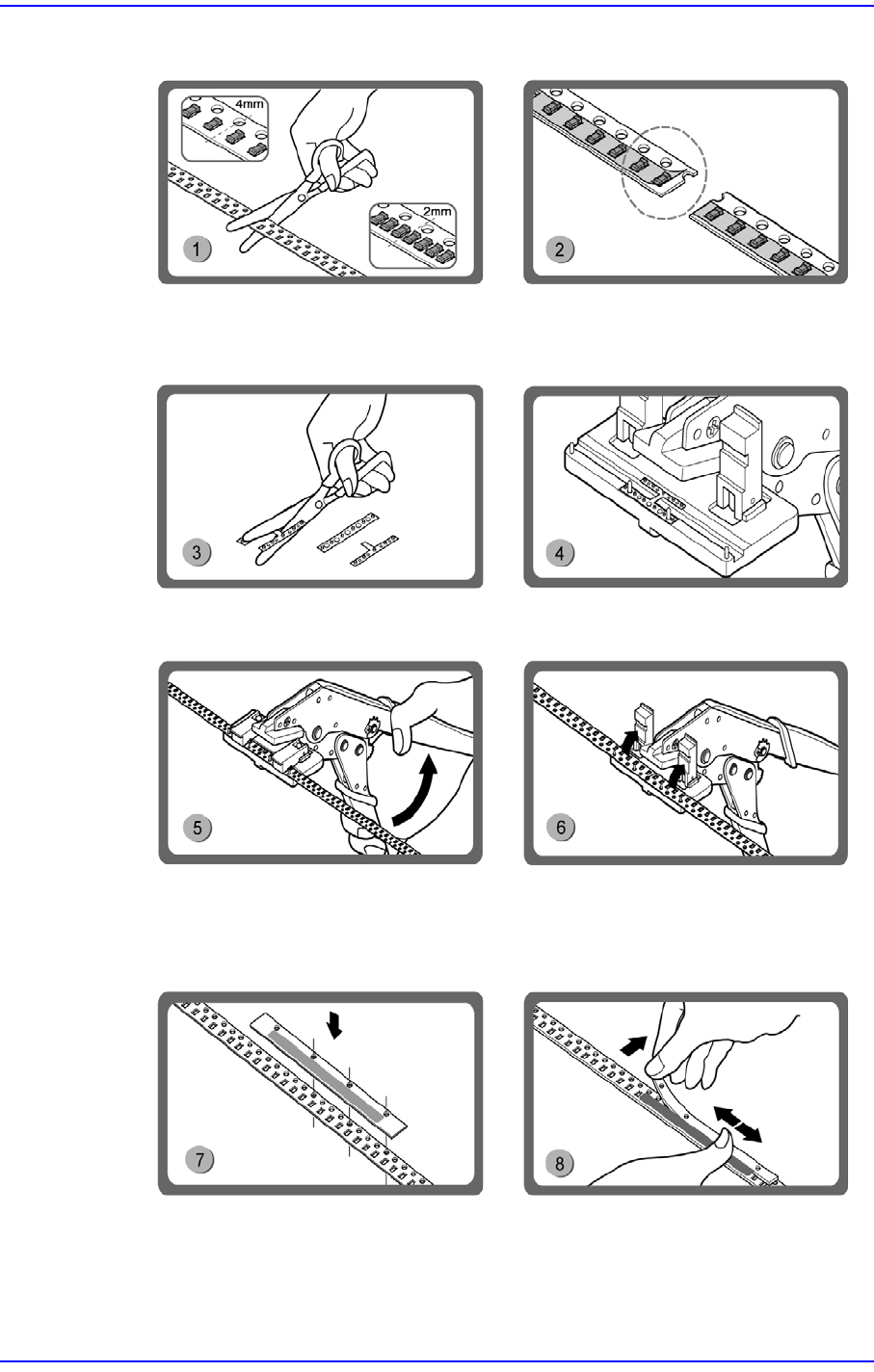 6-2 SM-Series SME DB Tape Feeder User's Manual 6.1.2. Tape Connecti on Method (Paper Type) Cut the end part o f the tape in use and the beginning p art of the new tape by using scissors. Peel off t he vinyl tape on …