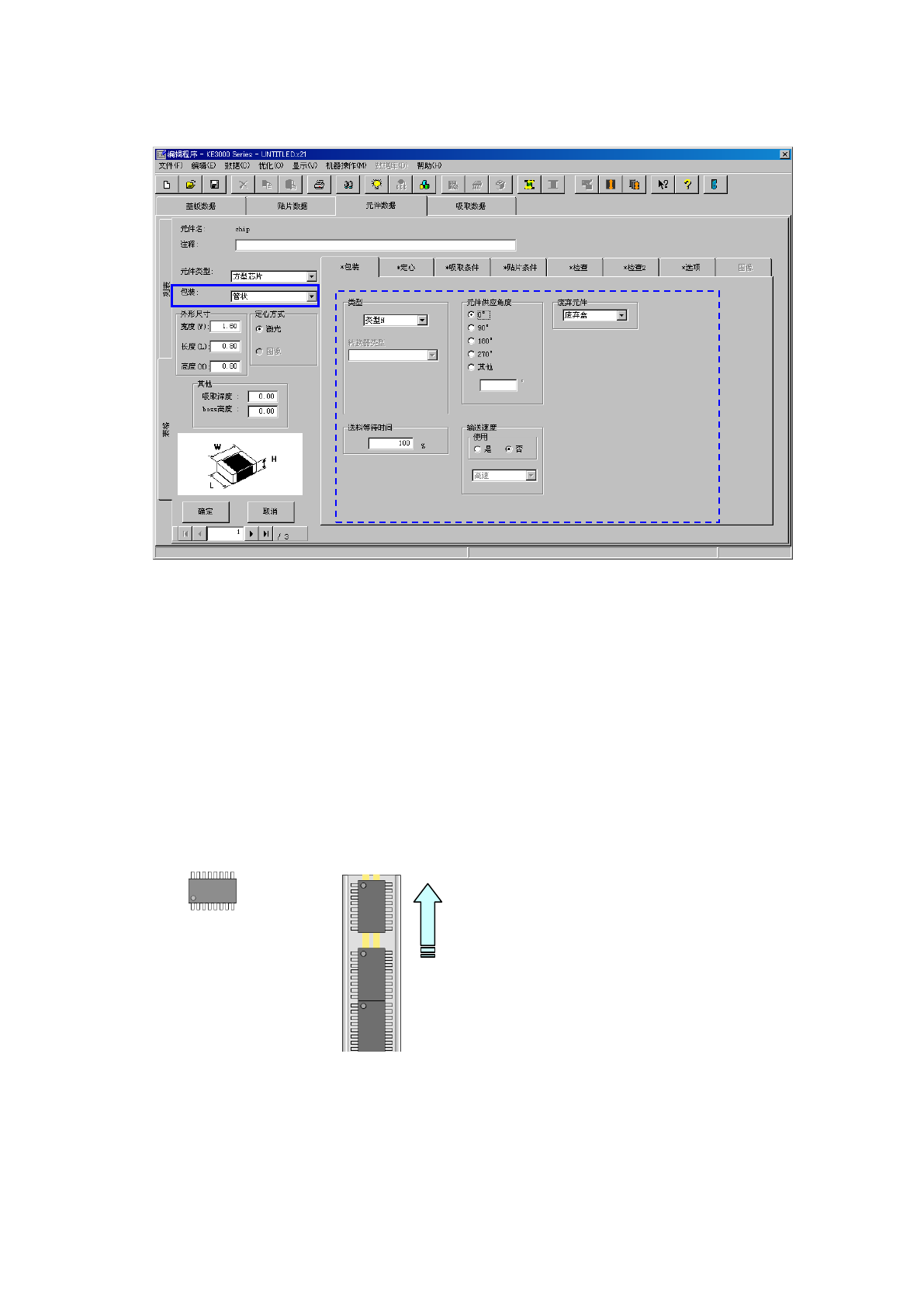 操作手册Ⅱ (2) 管状的输入 方法 1) 类型 选择管状供料器 的类型。 2) 送料等待时间 从元件吸取完成 后到可吸取 下一个元件之 间的等待时 间 ( 根据各供料 器型号设置的值 ) 与 实际 等待时间的比例 ,以百分 比的形式进行设 置。 初始值为 100% 。 3) 元件供应角度 以 JUK I 的元件供 应角度为 0° ,输入管状供料器 上的元件包装姿 势的倾斜 角度。 详细内容请参见 “ (1)带状的输入方法 ※ JUKI…