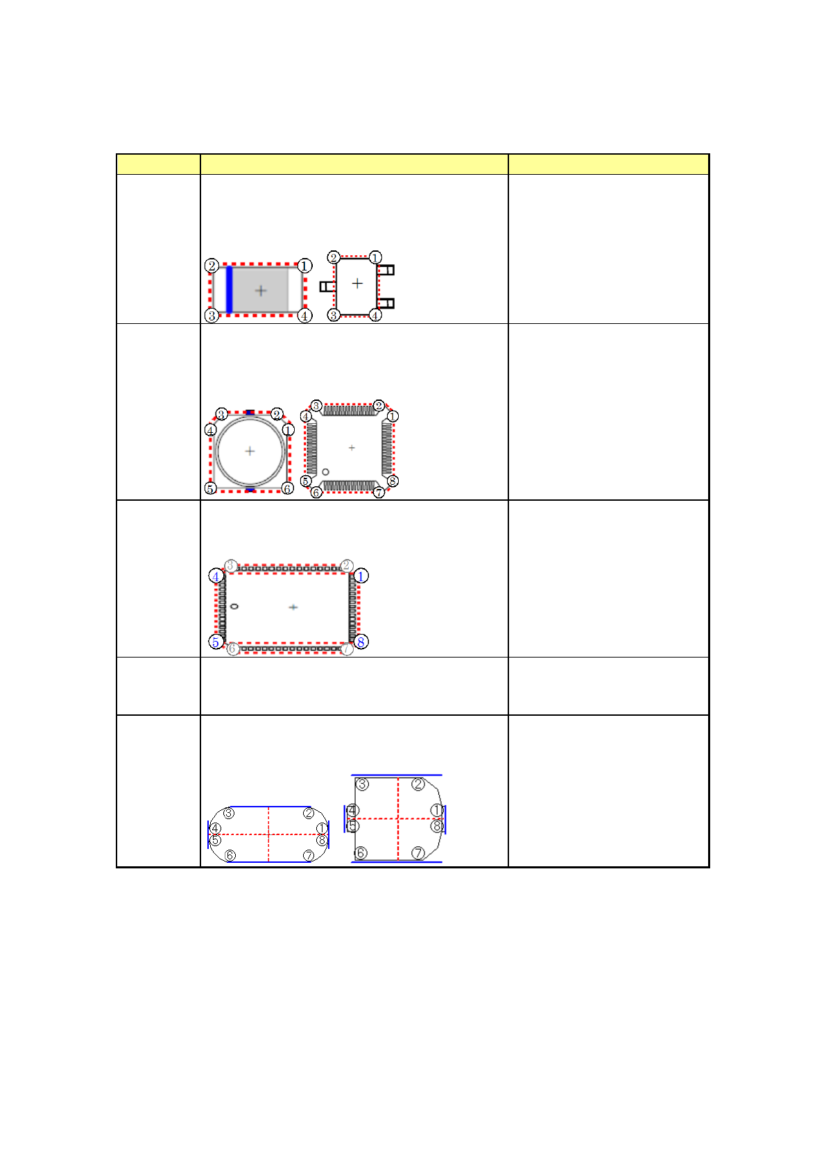 操作手册Ⅱ 元件形状 动作 用途 灵活 2 从测量结果检测 出元件的 左右对称的轴, 获取从 该轴至元件中心 坐标偏移 量,以及角 度偏移量, 进行贴片补偿处 理。 元件尺 寸就是 , 根据 经上述 计算测量的角度偏移量,以实 际元件角度 0° 测 量结果为基础, 判定的最 大幅度 X ・ Y 。 若是具有多个对 称轴的元件 时,为了能够正确获取元件 的 中心坐标,该形状为非常有 效 ( 例:左图中 「○ 」元件 ) 。 此外,只有 1…