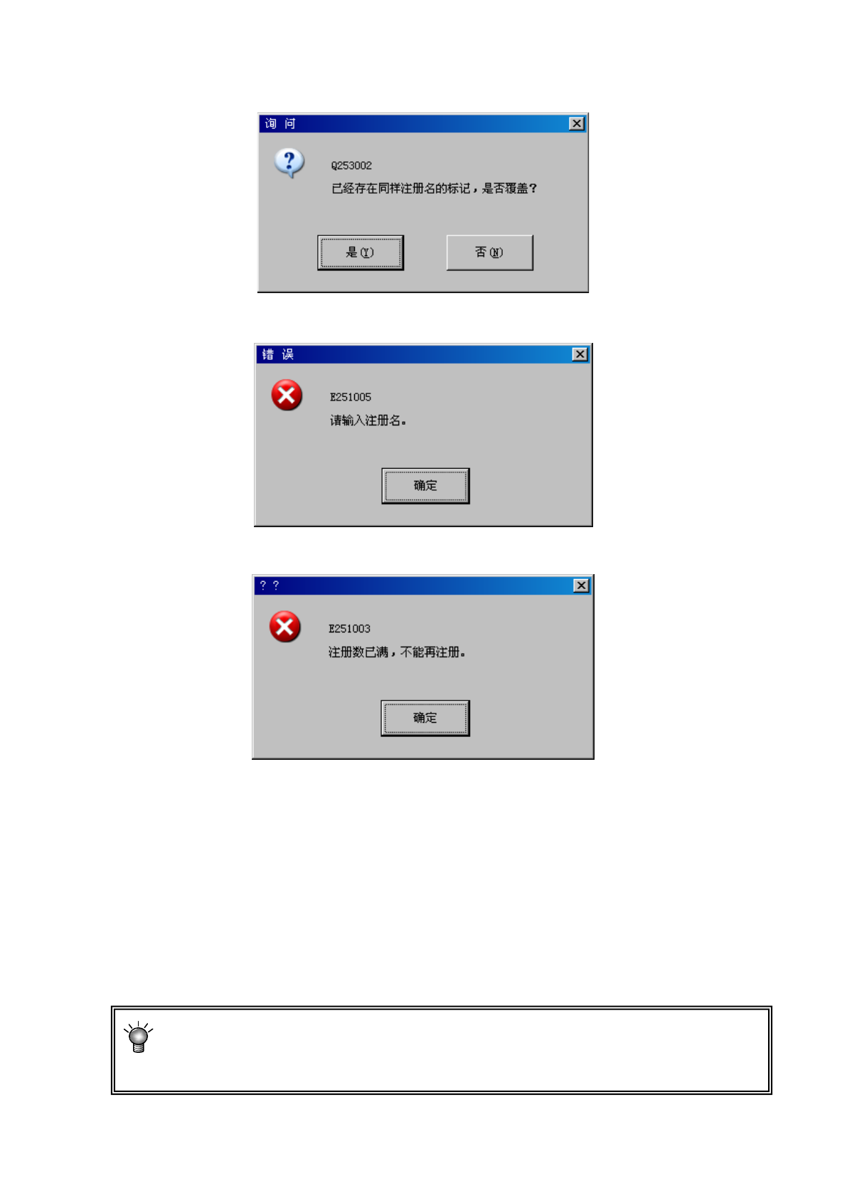 操作手册Ⅱ (3) 删除 可删除已经注 册的 (标记) 数据。 将光标调整到列 表中要删除的数据行 , 按下 “ 删除 ” 按钮时, 会显示如下 信息,在对话 框里按下 “ 是 ” 按钮(即可删除) 。 (4) 更改名称 可以更改 已经注册 的 (标记 ) 名称。 将光标调 整到列表 中要变 更的数据 行, 按下 “ 更改名称 ” 按钮时, 会显示如下信息 ,请在对 话框里输入新名 称。 (5) 注册 以注册名称编辑 框中设置 的名称,…