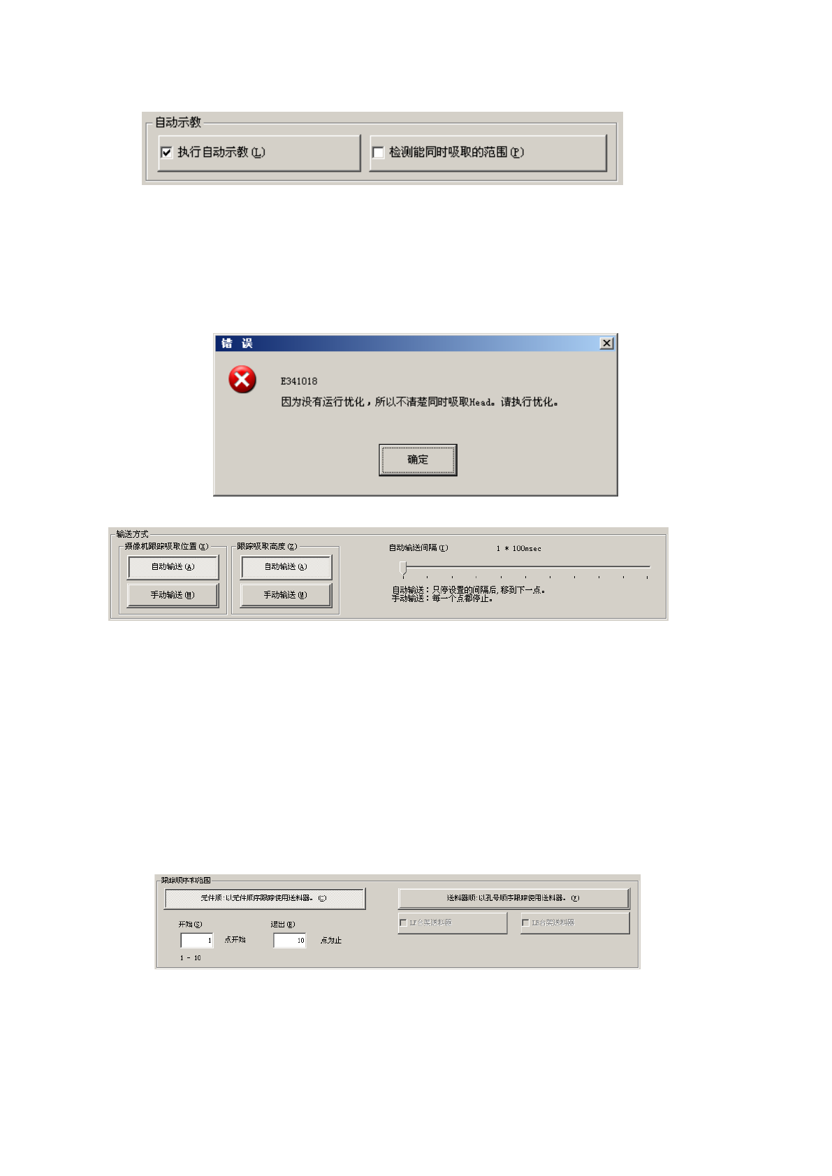 操作手册Ⅱ 5) 各点动作 (吸取高度跟踪 ) 可设置移动到各 跟踪点后 的动作。 a) 计测值有差分时停止 当 HMS 的检测值与吸 取数据中 设定的吸取高 度值之差超 出差异判定值 容许范围时 , 显示提 示信息并停止。 用滑动条对(差 分判定值 ) +-的上限/ 下限范围 进行设 置。 b) 不能计测时停止 不能用 HM S 测量时 ( 无元件时等 ) 显示 提示信息并停 止。 c) 读取计测值 对每一点 进行询问 ,并把 H M…