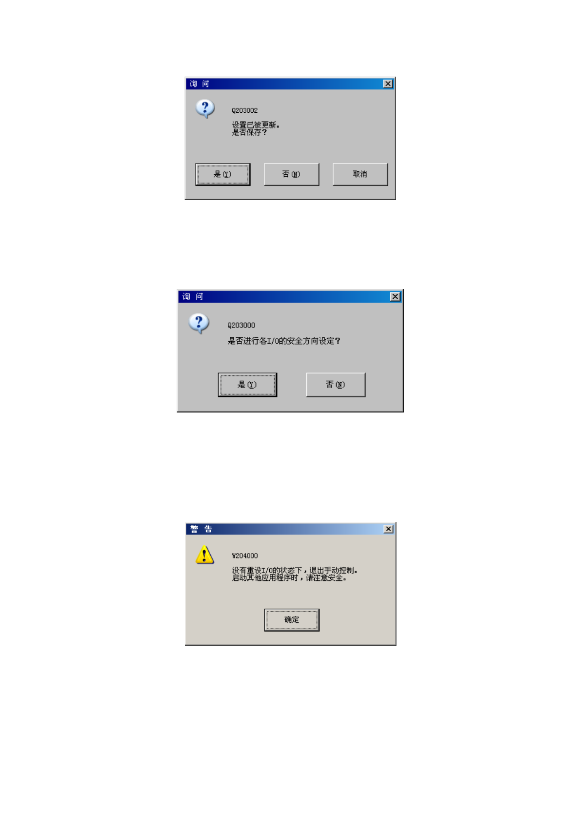 在各 I/O 安全方向设置确认提示信息中选择「否」时,会显示以下提示信息 。
