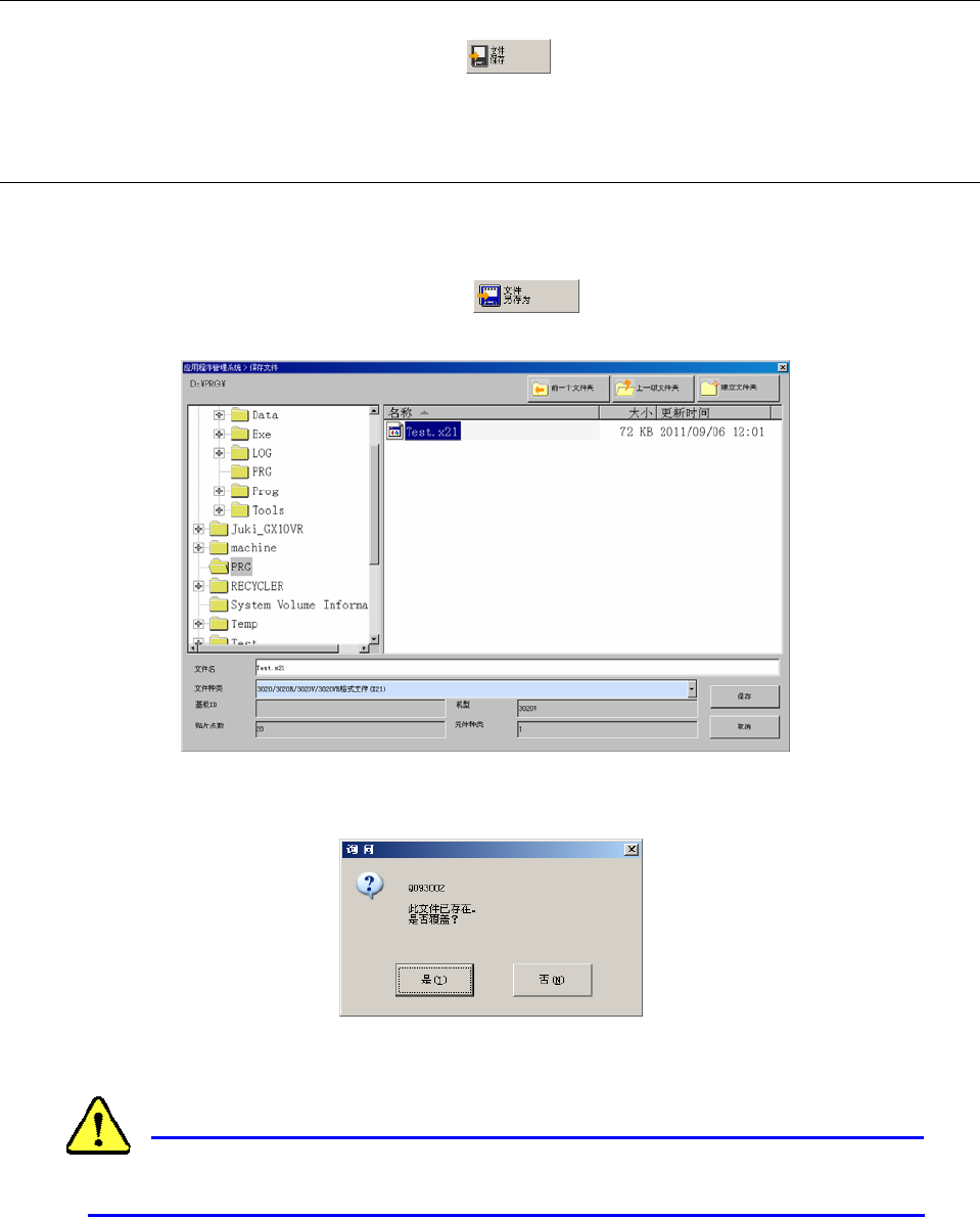 操作手册Ⅱ 1-43 1-7-3 保存 保存已制作的生产程序。 选择“文件” / “保存” , 或按命令按钮 , 即可执行保存命令。 1-7-4 另存为 将编辑后的生产程序保存于其他文件夹、或更改文件名保存时 , 选择“另存为”。 < 步骤 > ① 选择“文件” / “另存为” , 或按命令按钮 。 ② 在“另存为”画面上指定文件夹和文件 名后 , 单击“保存” 。 若指定已有的生产程序名 , 则会显示确认是否覆盖保存的信息…