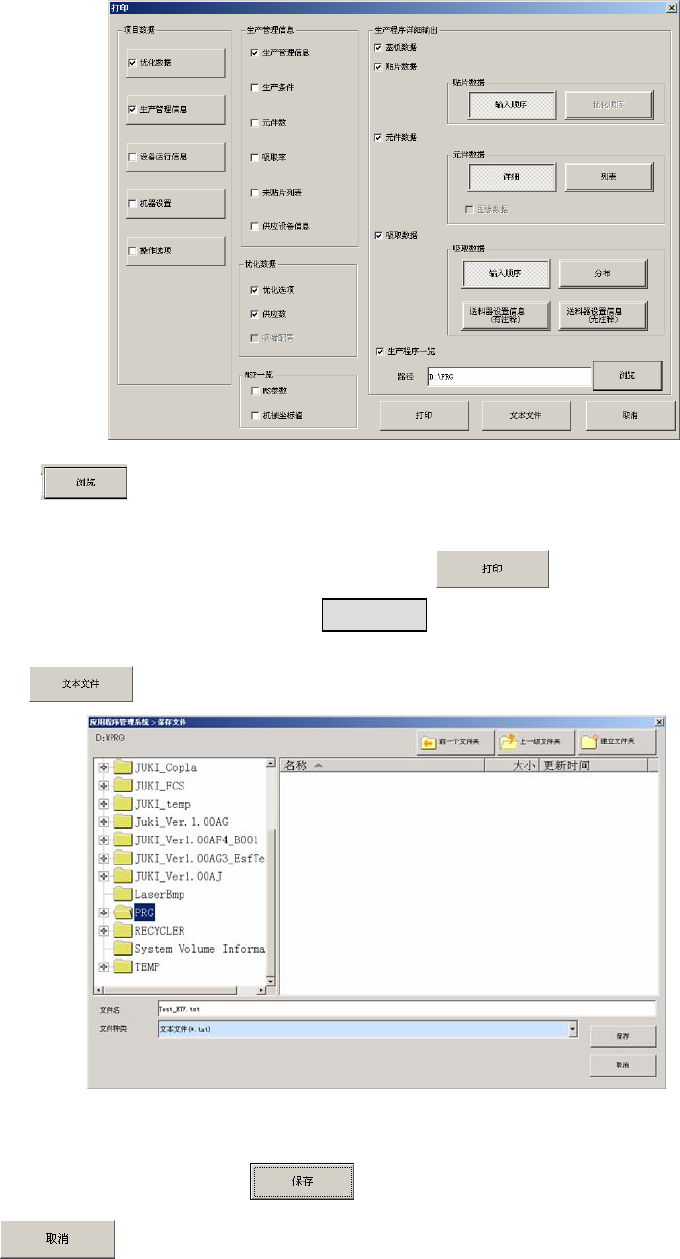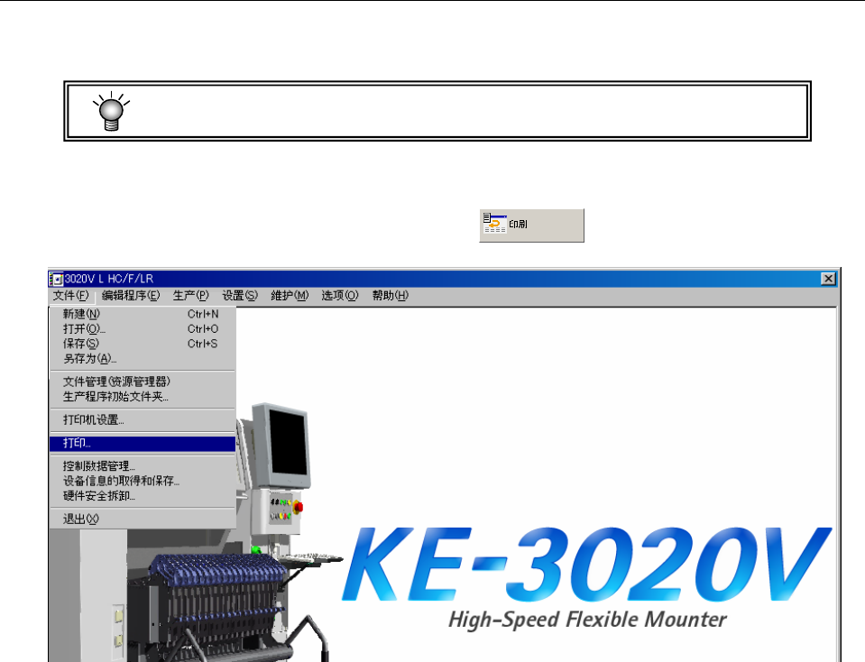 操作手册Ⅱ 1-47 1-7-8 打印 打印生产管理信息、装置运行信息、机 器设置状态、或操作选项内容等。 可选择打印或输出文本文件( txt 格式) 。 要打印,必须安 装打印驱动程序。 (参 见 1-7-7 章 ) (1) 打印步骤 ① 「 从菜单选择 文件/「打印」 、或从命令按 钮选择 。