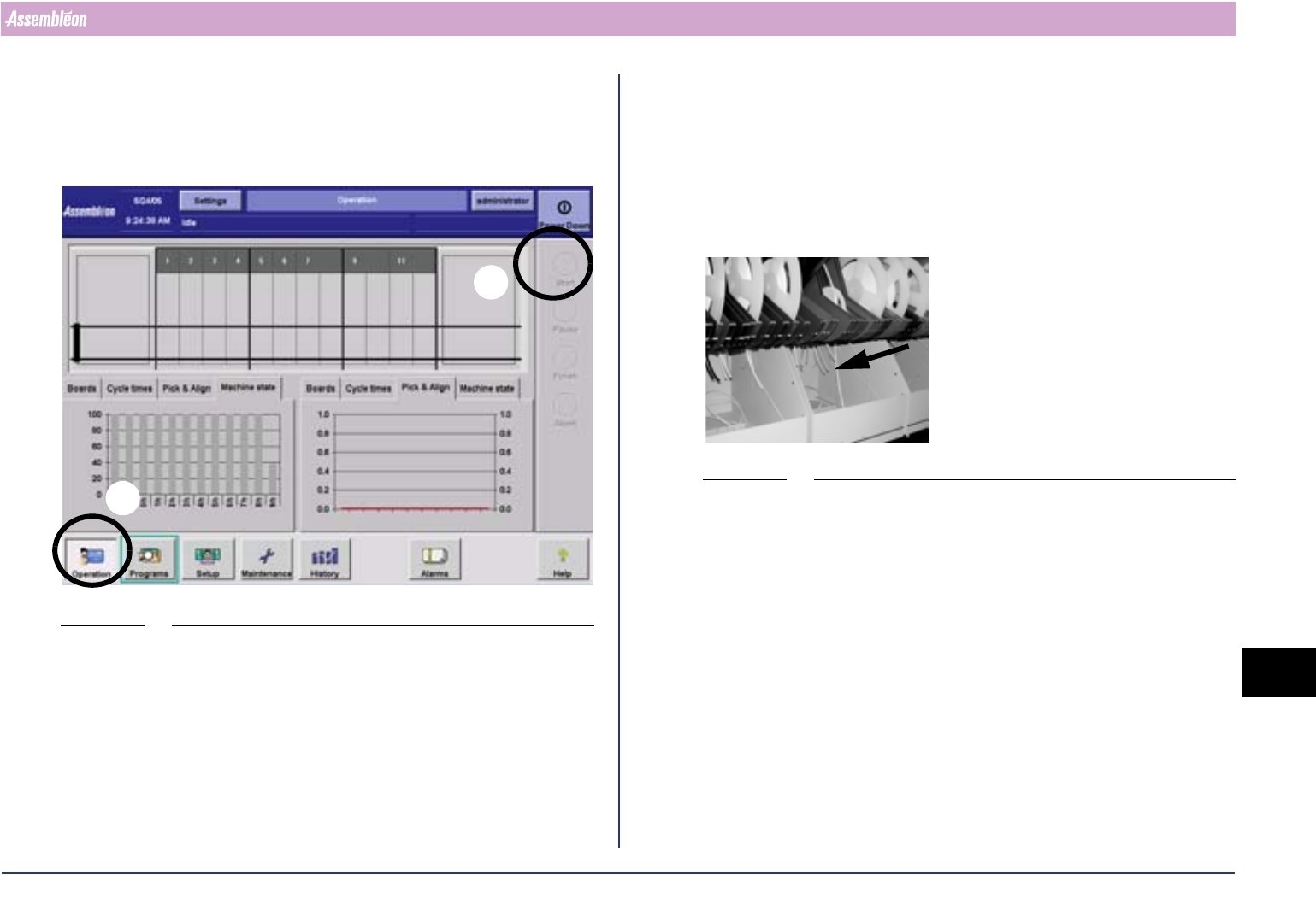 4022 593 50071 操作手册 05.01 AX 系列 43 生产 第 9 章生产 如果遇到错误,请参阅第 10 章 错误处理 9.1 开始生产 图 46 开 始生产 开始生产: • 选择 “操作”按钮 (1) 。 • 选择 “开始”按钮 (2) 。 如果没有出现错误消息,机器即开始生产。 如果出现错误消息,请参阅第 10 章 错误处理 。 1 2 9.2 维持生产 9.2.1 拼接料带 请参阅 附录 。 9.2.2 在供料器上…