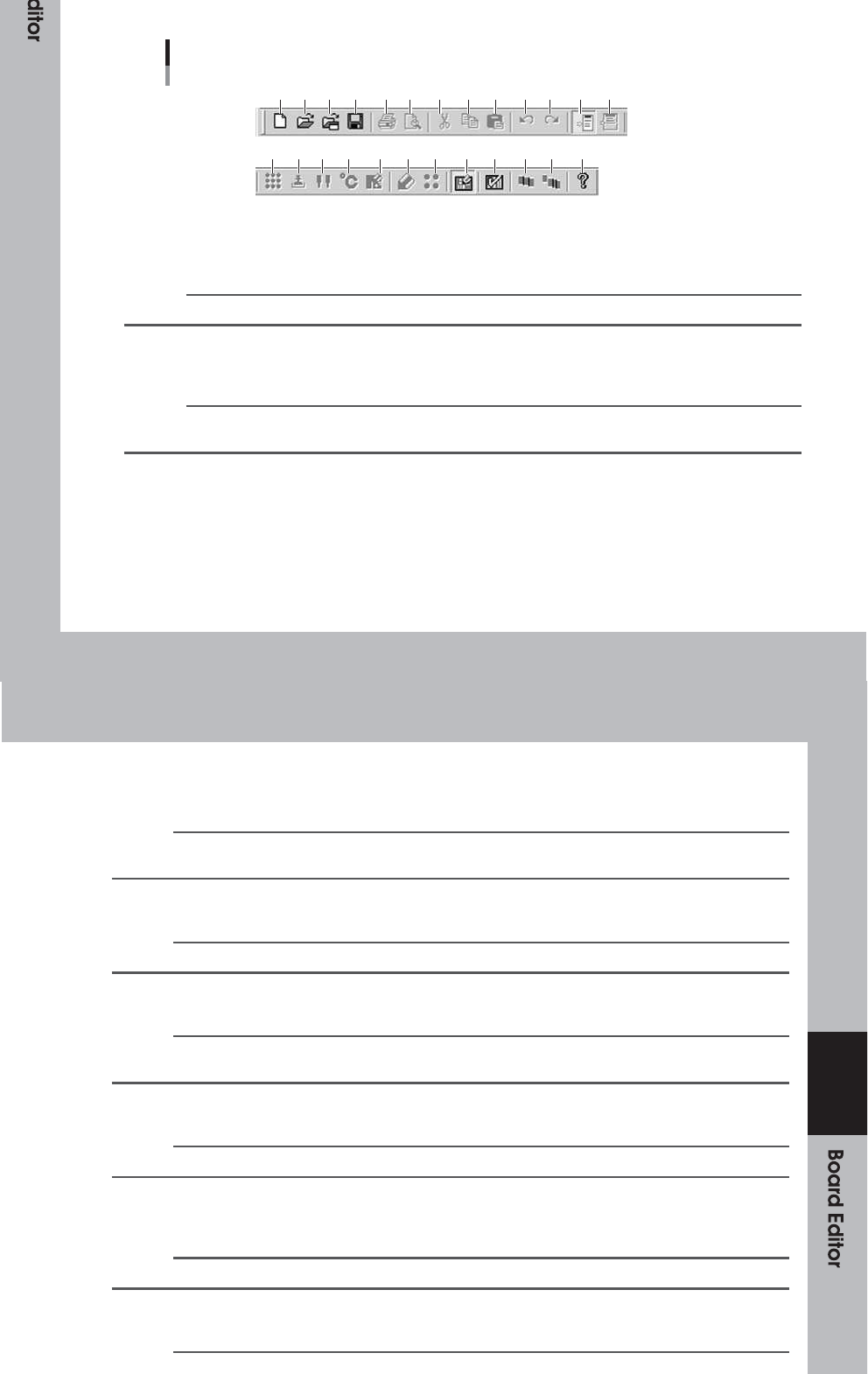 当 您操 纵 “ B oa r d E di t or ” 窗口 时 ,此 工 具栏 可 用。 标准工具栏 1 个 2 个 3 4 5 6 7 8 9 10 11 12 13 1 个 4 15 16 17 18 19 20 21 22 23 24 25 64 30 9- S0- 00 1 个 。 [ 新 板 数据 ] 按钮 单 击此 按 钮以 创 建新 的 电路 板 数据 。 加 载初 始 数据 以 创建 新 的电 路 板数 据 。 参…