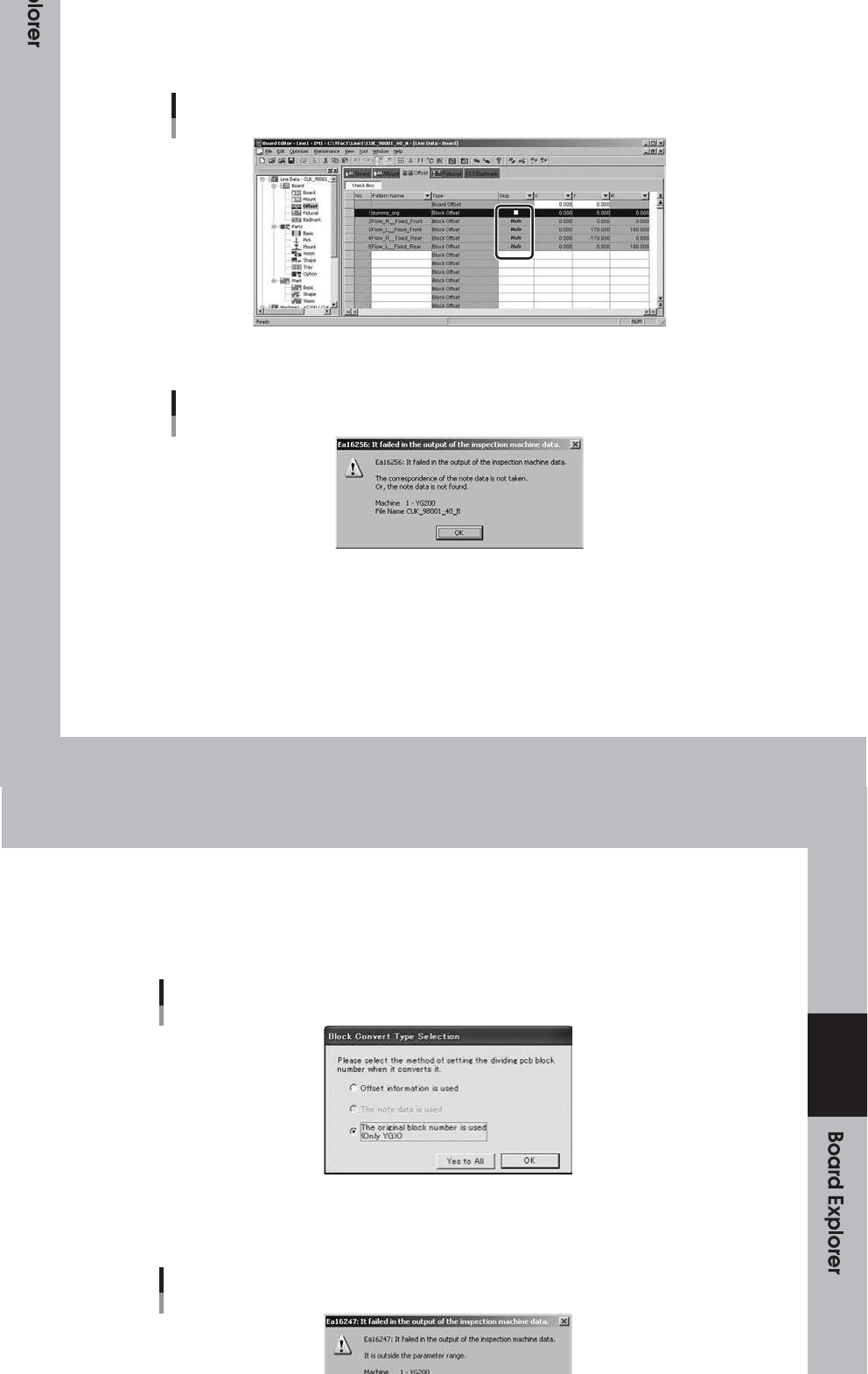 64 2A 9- S0- 00 ñ 使 用参 考 资 料 通 过此 设 置, 参 考数 据 将用 于 多块 P CB 块 编号 。 使用 此 设置 已 转换 电 路板 数 据 以 块分 布 打开 。 使用参考资料 64 2B 1- S0- 00 没 有参 考 数据 或 与参 考 数据 不 一致 时 ,将 指 示错 误 。 错误对话框 64 2B 2- S0- 00 2 个 -26 ñ 使 用原 始 块 号 ( 仅 Y G X ) 仅 当…