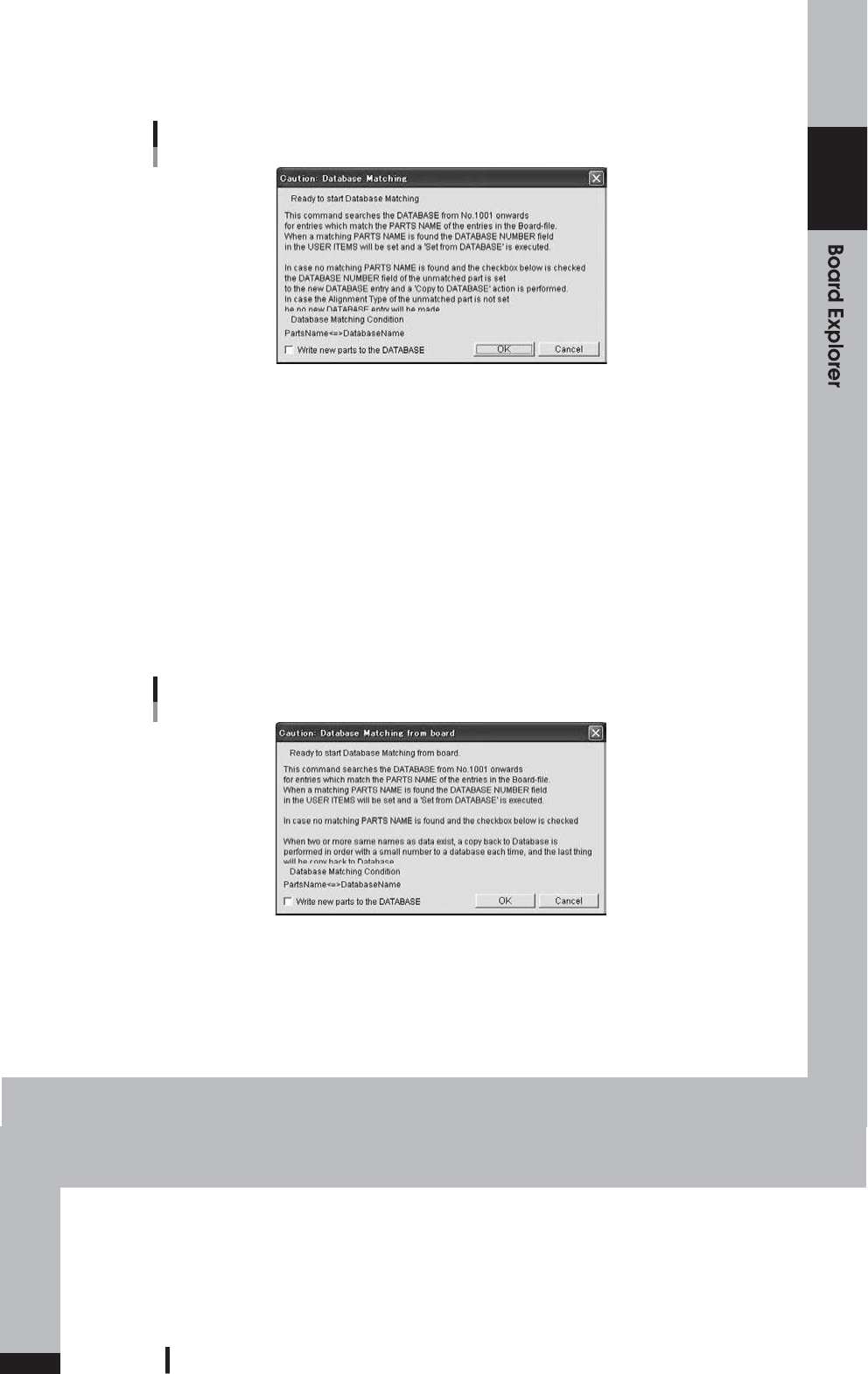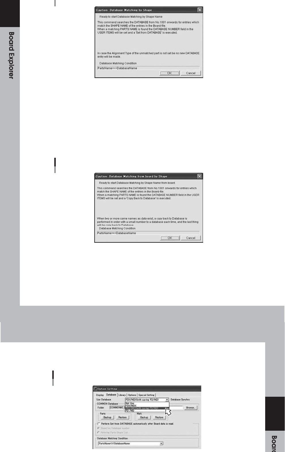 ” “ 数 据 库 匹配 ” 是 针对 “ 数 据库 实 用 程序 ” 窗 口或 “ 数 据库 实 用 程序 ” 窗 口中 指 定 的板 分 批 执行 的 。 使 用板 浏 览 器选 择 的 板。 当 您单 击 “ 数据 库 实 用程 序 ” 窗口 中 的 [ 数 据 库 匹配 ] 按 钮时 , 处 理将 在 显 示确 认 对 话框 。 通 过使 用 板 子选 择 板 子可 以 执 行相 同 的 操作 资 源管 理 器 ,选 择 “ 数…