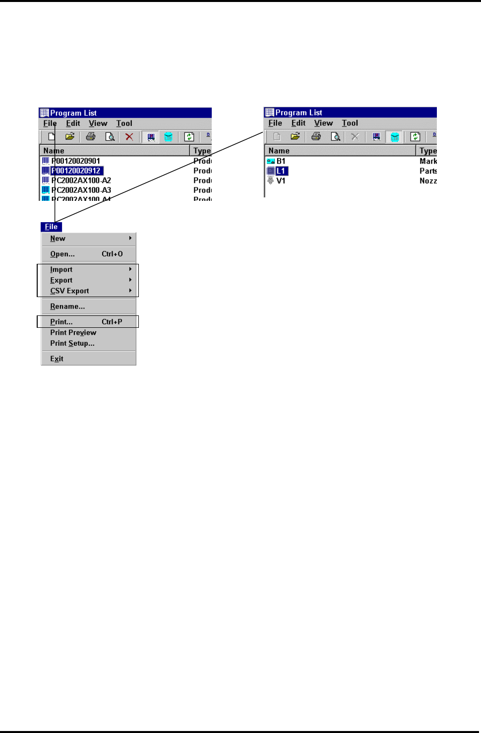 == 如要显示‘品种程序’和‘程序库的程序’列表窗口,请参照‘Prg’ / ‘程序编制概要’ / ‘程