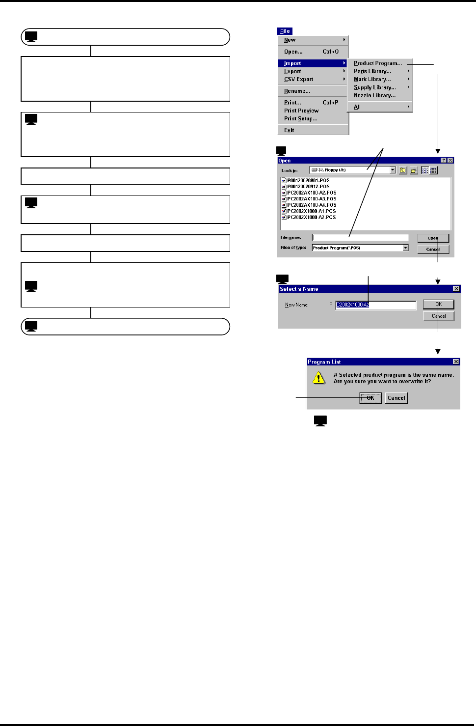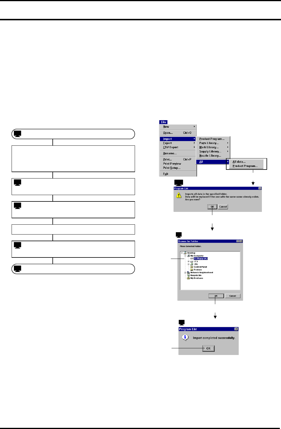 BM122 编程手册 7.2 导入 / 导出 E34PCC-4 0-030-B0 7.2-1 5. 3. : ‘ Browse fo r Folder ’ (浏 览文件夹) 4. 7.2. 导入 / 导出 E34PCC-4 0-030-B0 7.2.1 导入数据 将文本格式数据转换成 二进制格式并 载入。 可以从软盘之外的其它 媒介导入数据 文件。 可以在品种程序和程序 库的程序列表 窗口进行导入处理 。 = = 要显示程序 列表窗…