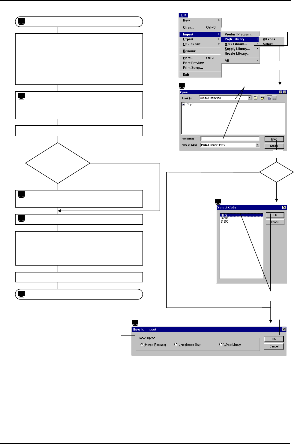 BM122 编程手册 7.2 导入 / 导出 E34PCC-4 0-030-B0 7.2-4 = 提示 = 举例) 源数据和目标数据存在相同 元件程序库名 时,处理形状代码。 目标数据 源数据 下载前 下载后 下载选项 程序库 : L1 L1 合并(替换) 用下载数据覆盖机器中的数据。 形状代码 QFP06 QFP07 QFP08 QFP01 QFP02 QFP03 QFP06 QFP07 QFP08 仅指未登录的 原名与下载名相同时,…