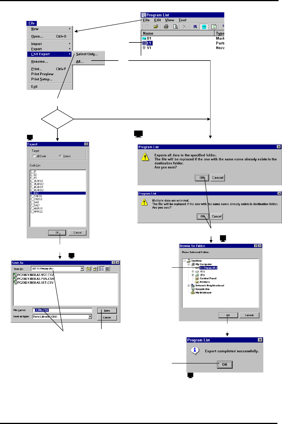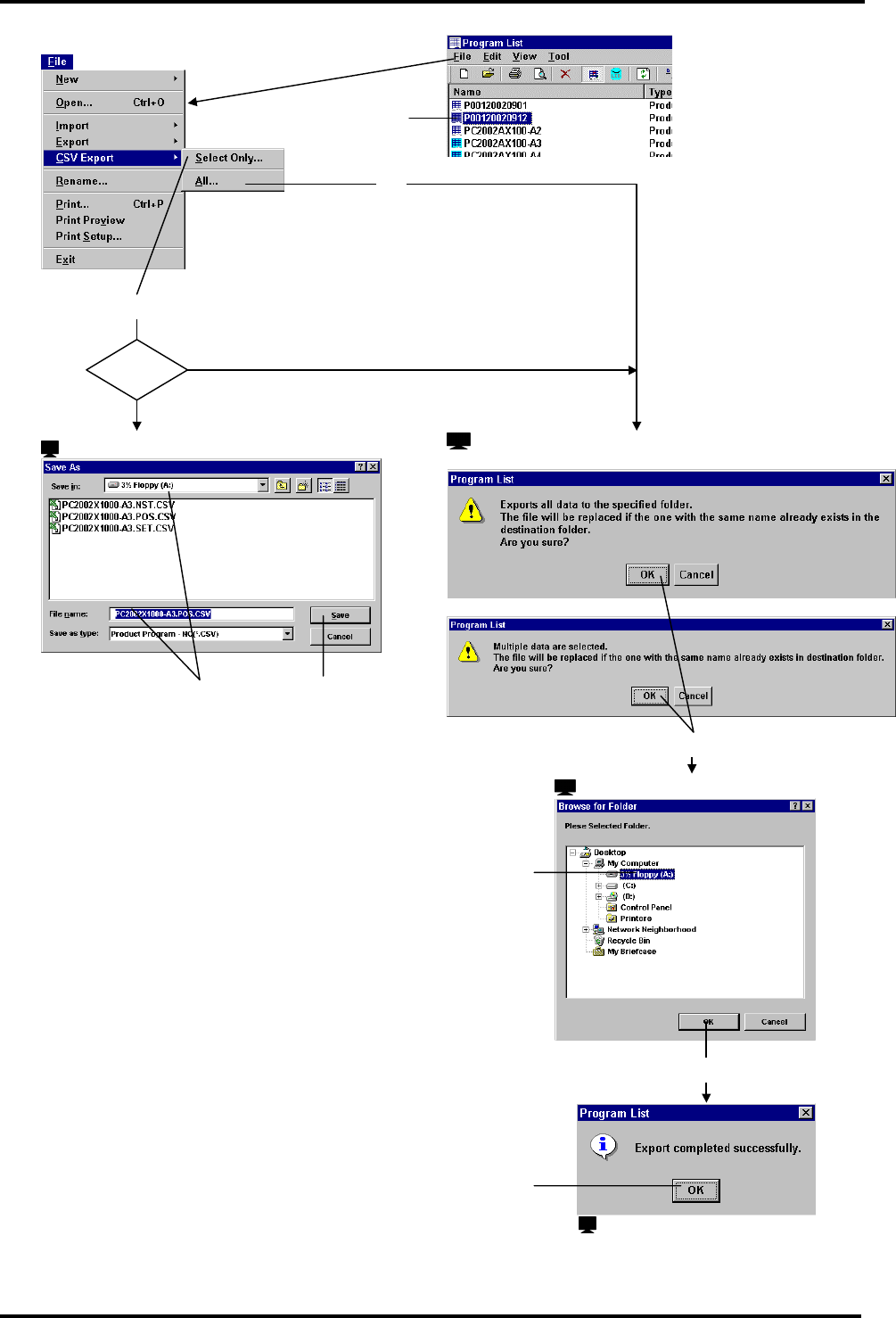 BM122 编程手册 7.3 CSV 导出 E34PCC-4 0-120-B0 7.3-3 元件 / 标志程序库 : ‘ Program List ’ (程序一览) 1. 选择一个程序库 2. [File]-[CSV Export]- [Selec t Only] [ 文件 ] - [CSV 导出 ]- [ 仅选择 ] 目标数据 多少数据 : ‘Save As’ ( 另存 为 ) 4. 指定‘查找范围’和‘ 文件名称 5. <…