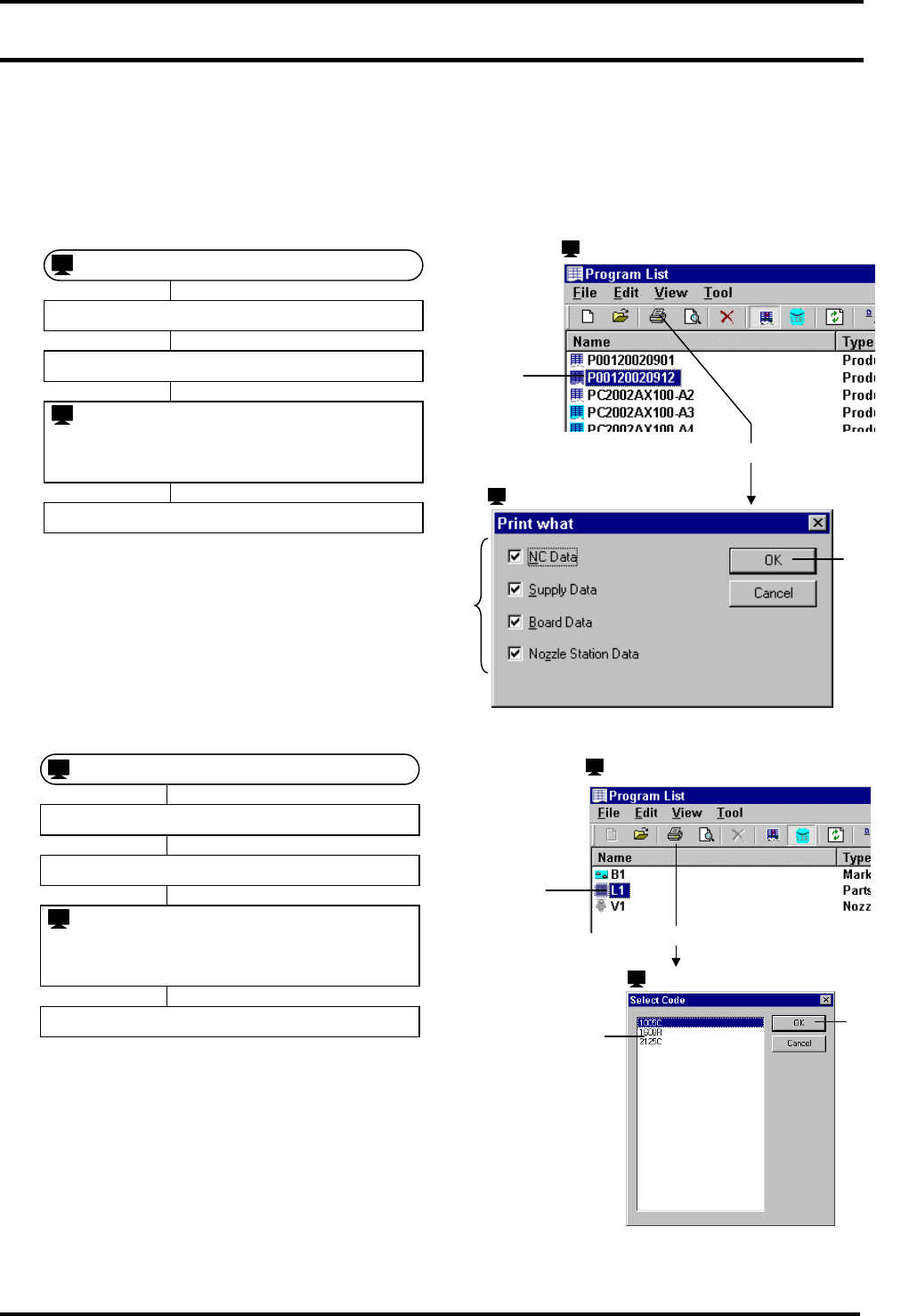 BM122 编程手册 7.4 打印 E34PCC-4 0-040-B0 7.4-2 打印输出(举例) 打印输出随着选择数据 的不同而变化 。 NC 数据 进料器数据 基板数据 吸嘴站数据 元件程序库