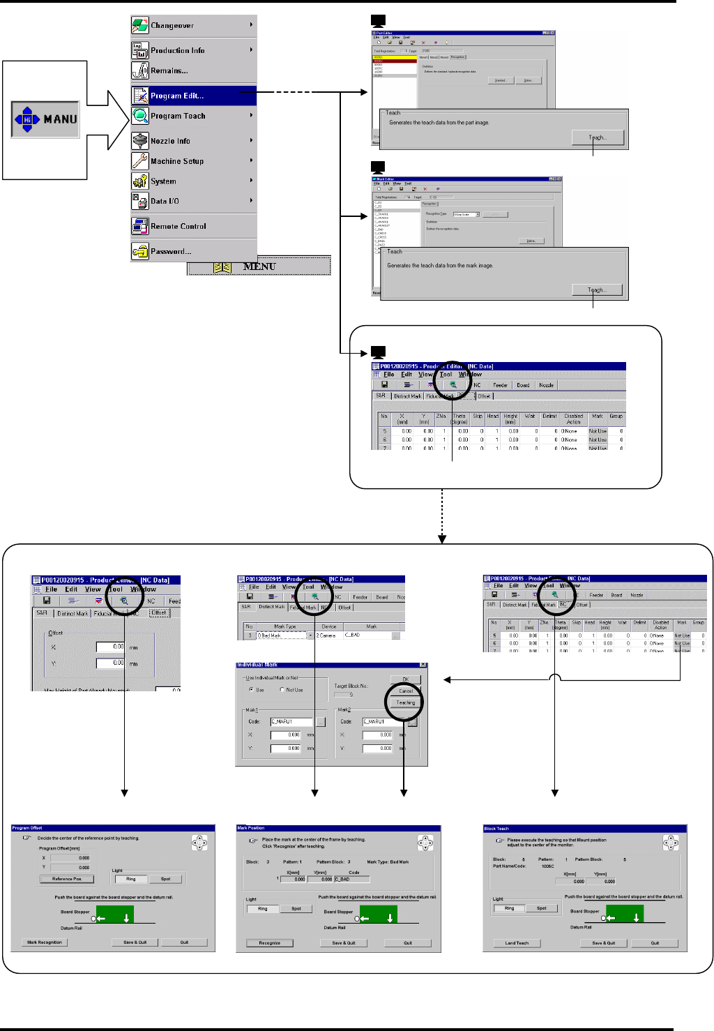 BM122 编程手册 8.1 概要 E34PCC-3F-0 10-B0 8.1-3 4. 1. 2. 3. 5. 8.1.3 用来修改现 存数据的主 要功能 1. 程序补偿 通过示教允许设定在品 种程序的 NC 数据‘补偿’页中的项目。 补偿:一块基板的 PCB 基准位置和 X/Y 坐标原点之间的差异补 偿。 2. 标记位置检查( 标记位置) 允许确认品种程序中标 记的位置,并 通过示教后进行必 要的修改。 3. 吸着位置检查( 吸着位…