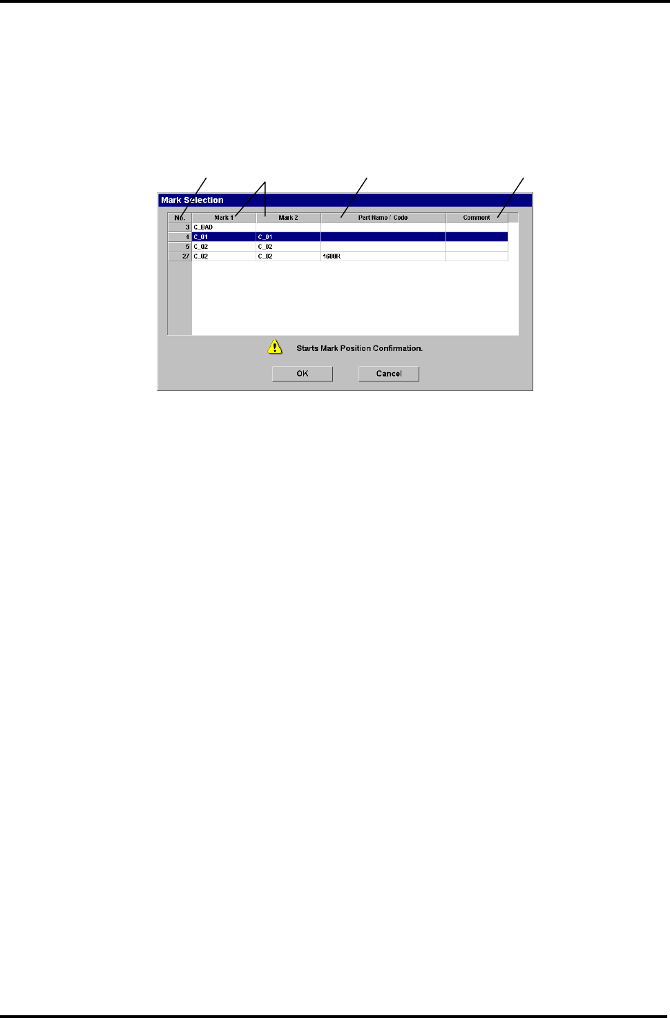 打开 Mark Selection(标记选择)画面,显示使用的全部标记(鉴别标记、基准标记、单独标记)。