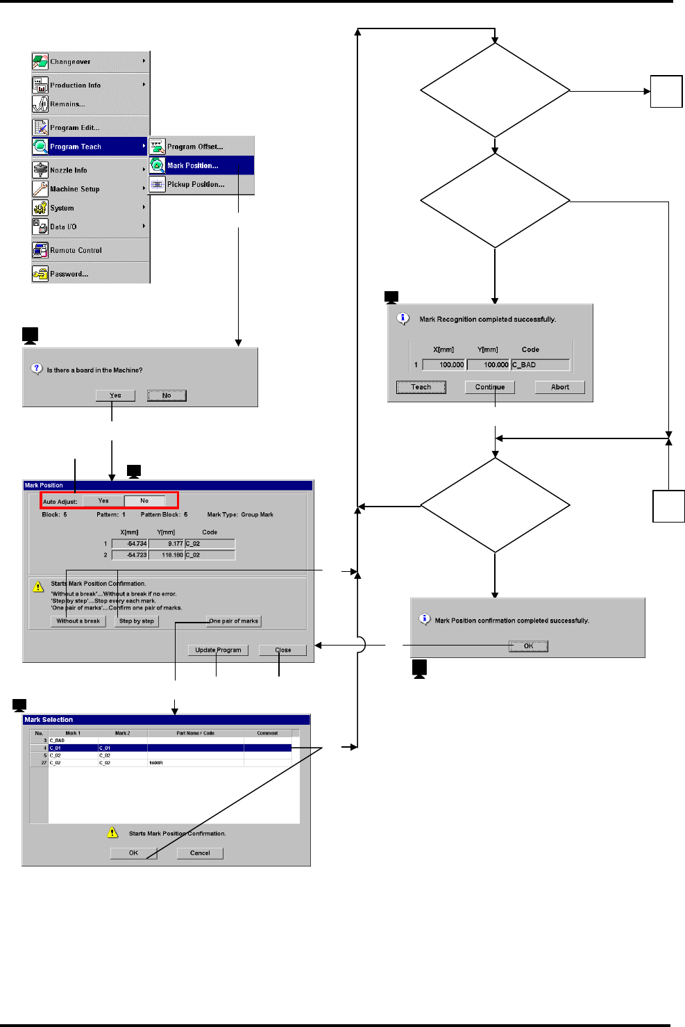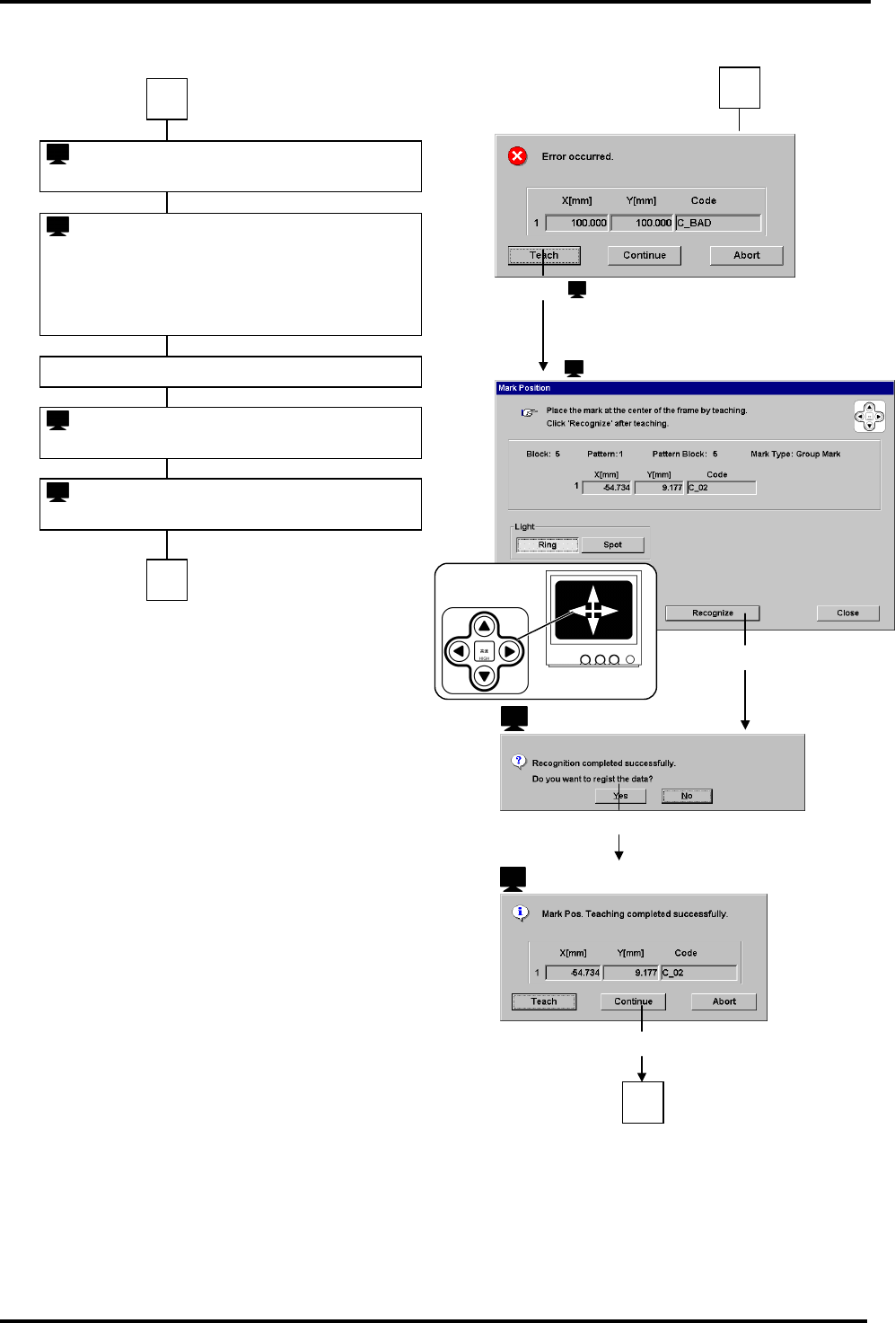 BM122 编程手册 8.3 检查标记位置 E34PCC-3F-1 10-B0 8.3-7 1. :‘Succ essful Mark Teaching‘( 成功的标记示 教 ) 标记位置检查发生错误时的对策 = 提示 = 1 使用 <Ring> ( 散光 ) 或 <Spot>( 聚光 ) 转换照明, 可以清楚 地 显示识别监控器。 = 提示 = 2 如果识别没有顺利的完成,选择 <YES >( …