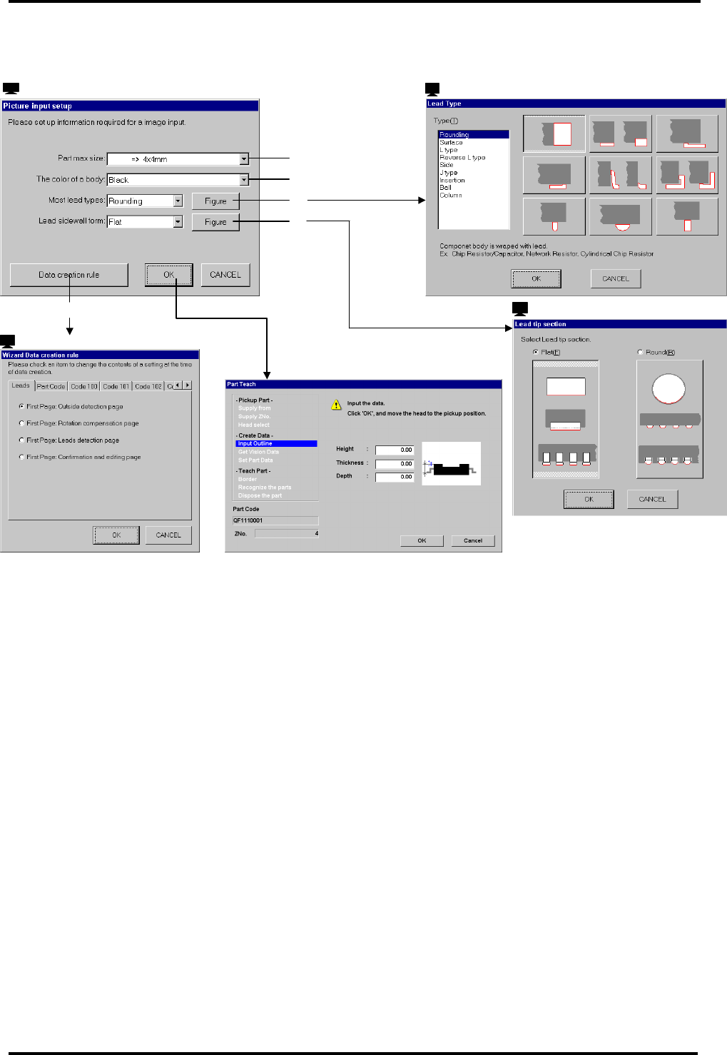 BM122 编程手册 8.8 创建元件数据 E34PCC-3F-0 90-B0 8.8-2 1. 2. 3. 4. : ‘Wizard’( 数据创建向导 ) 8.8.2 预先设定的项 目 点击 <Teac h>( 示教 ) ,并选择一个贴 装头打开图片输入 设置窗口。 在该窗口上,设定项目 以描述元件的 大概特征。 1. 元件最大 尺寸 从下拉列表中选择元件 尺寸以确定使 用的照相机(视野 大小)。 2. 主体颜色 从下拉列…